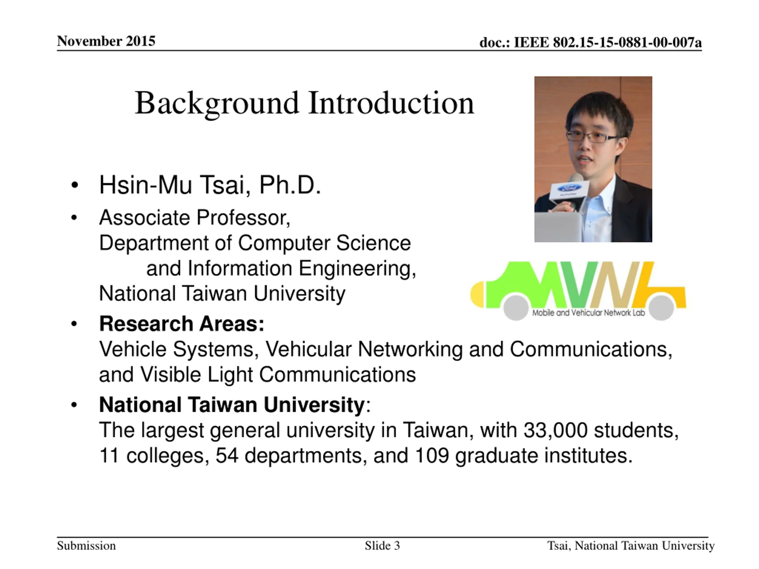 November 2015 doc.: IEEE 802.15-15-0881-00-007a Background Introduction Hsin-Mu Tsai, Ph.D. Associate Professor, Department of Computer Science and Information Engineering, National Taiwan University Research Areas: Vehicle Systems, Vehicular Networking and Communications, and Visible Light Communications National Taiwan University: The largest general university in Taiwan, with 33,000 students, 11 colleges, 54 departments, and 109 graduate institutes. Submission Slide 3 Tsai, National Taiwan University