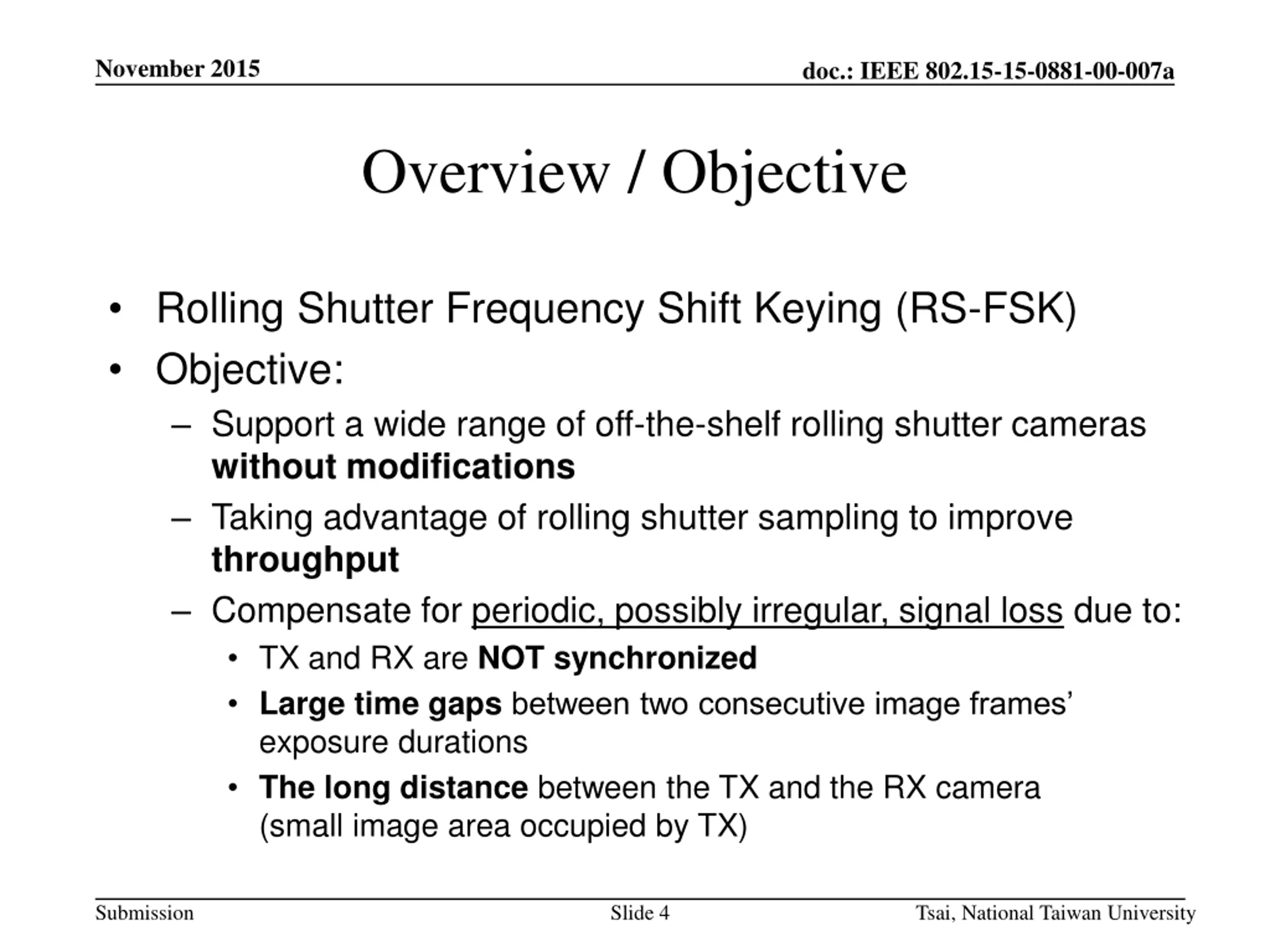 November 2015 doc.: IEEE 802.15-15-0881-00-007a Overview / Objective Rolling Shutter Frequency Shift Keying (RS-FSK) Objective: Support a wide range of off-the-shelf rolling shutter cameras without modifications Taking advantage of rolling shutter sampling to improve throughput Compensate for periodic, possibly irregular, signal loss due to: TX and RX are NOT synchronized Large time gapsbetween two consecutive image frames exposure durations The long distance between the TX and the RX camera (small image area occupied by TX) Submission Slide 4 Tsai, National Taiwan University
