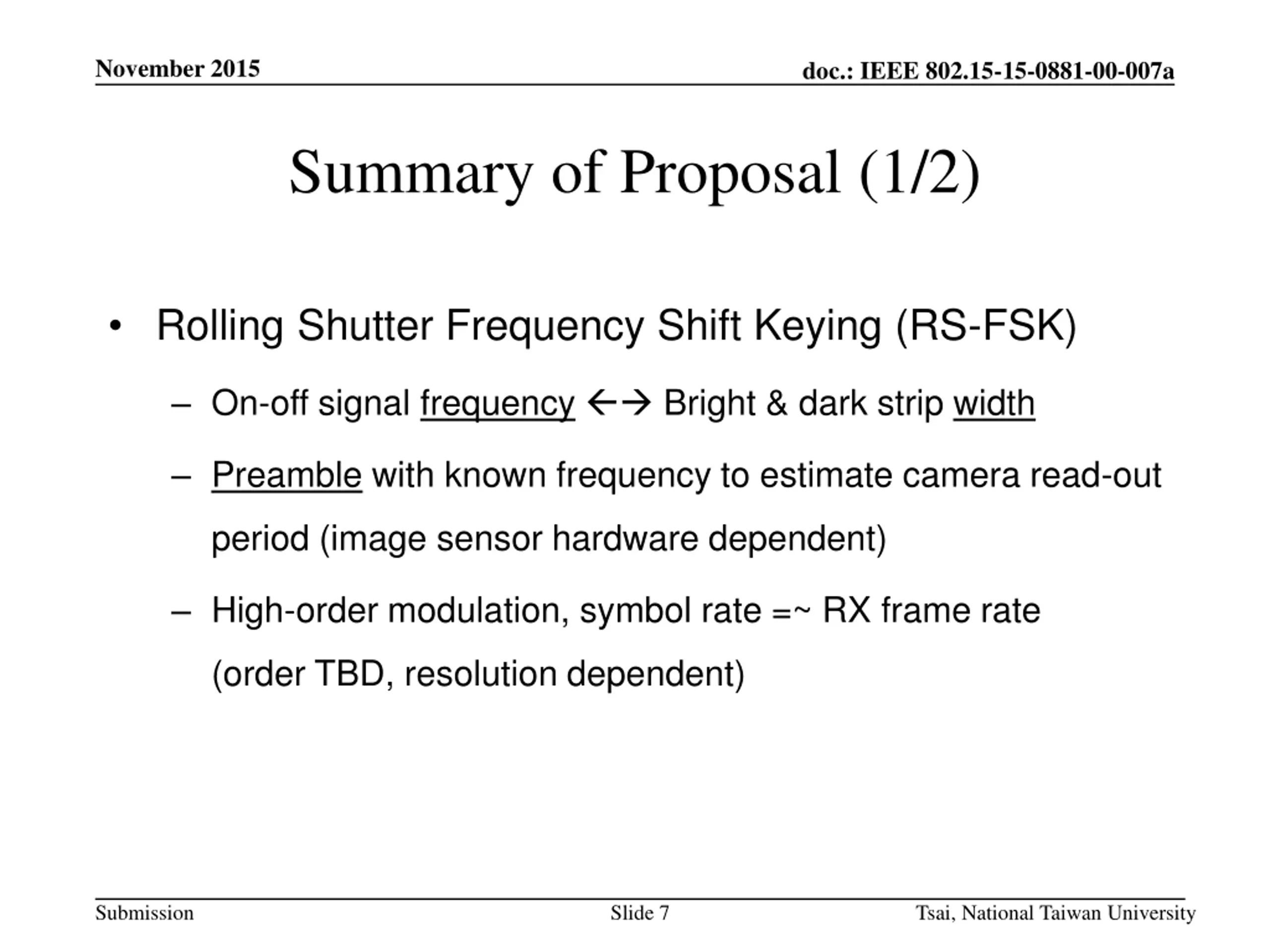 November 2015 doc.: IEEE 802.15-15-0881-00-007a Summary of Proposal (1/2) Rolling Shutter Frequency Shift Keying (RS-FSK) On-off signal frequency Bright & dark strip width Preamble with known frequency to estimate camera read-out period (image sensor hardware dependent) High-order modulation, symbol rate =~ RX frame rate (order TBD, resolution dependent) Submission Slide 7 Tsai, National Taiwan University