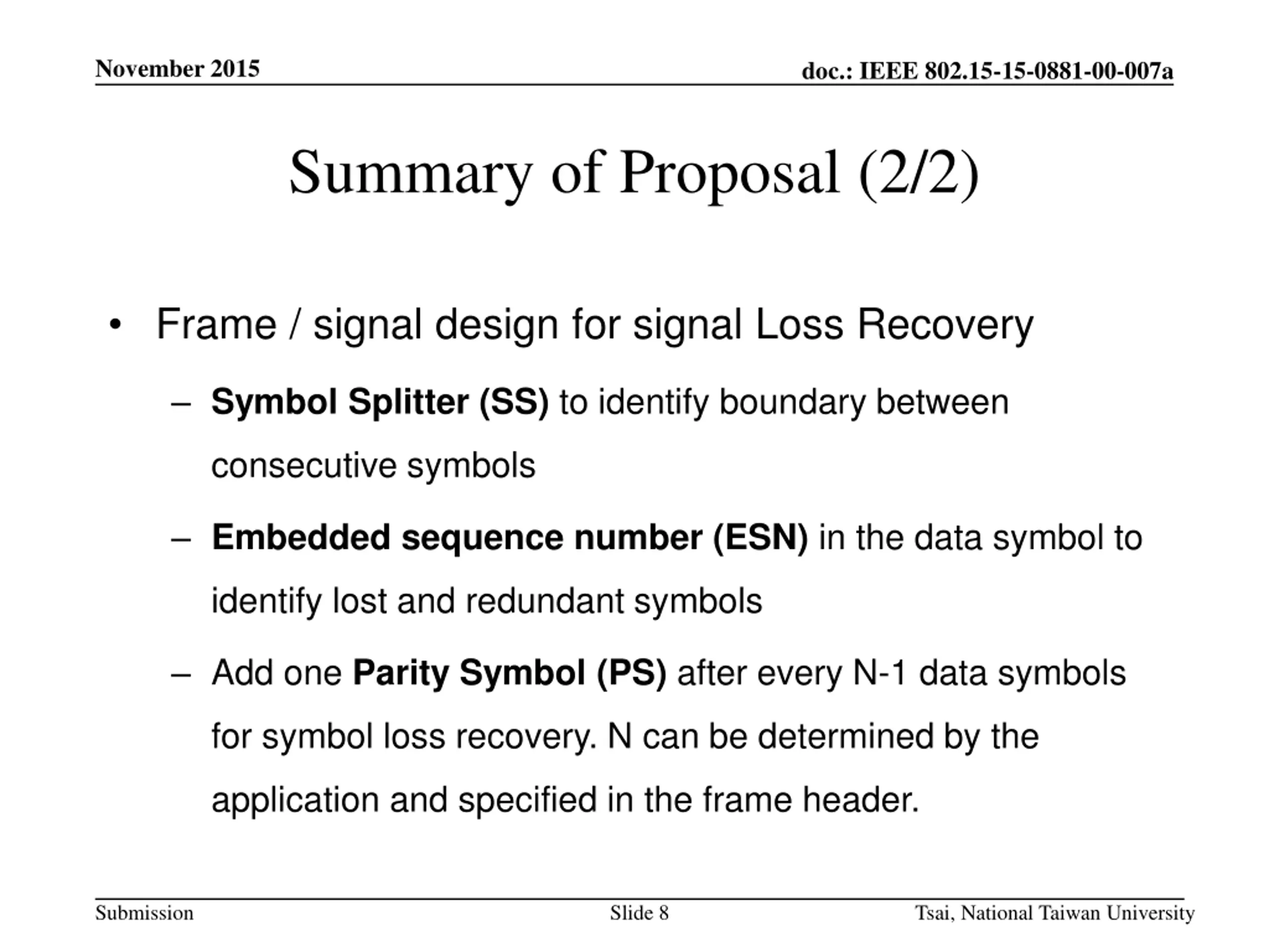 November 2015 doc.: IEEE 802.15-15-0881-00-007a Summary of Proposal (2/2) Frame / signal design for signal Loss Recovery Symbol Splitter (SS) to identify boundary between consecutive symbols Embedded sequence number (ESN) in the data symbol to identify lost and redundant symbols Add one Parity Symbol (PS) after every N-1 data symbols for symbol loss recovery. N can be determined by the application and specified in the frame header. Submission Slide 8 Tsai, National Taiwan University