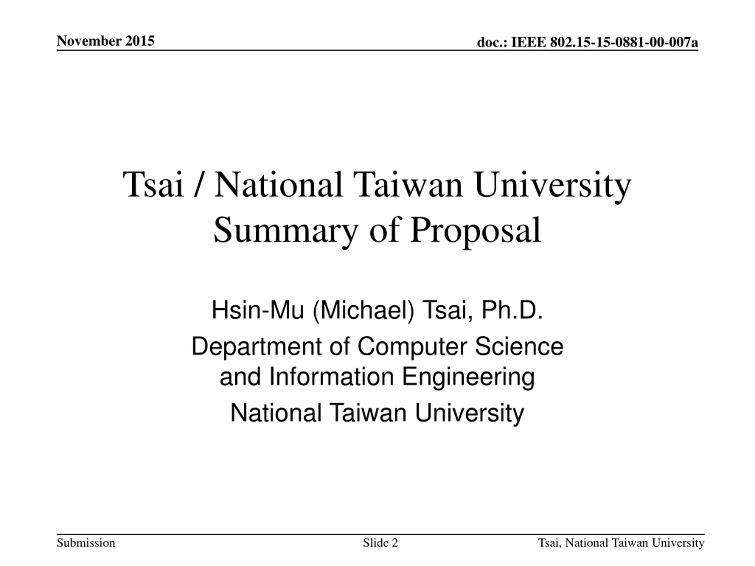 November 2015 doc.: IEEE 802.15-15-0881-00-007a Tsai / National Taiwan University Summary of Proposal Hsin-Mu (Michael) Tsai, Ph.D. Department of Computer Science and Information Engineering National Taiwan University Submission Slide 2 Tsai, National Taiwan University