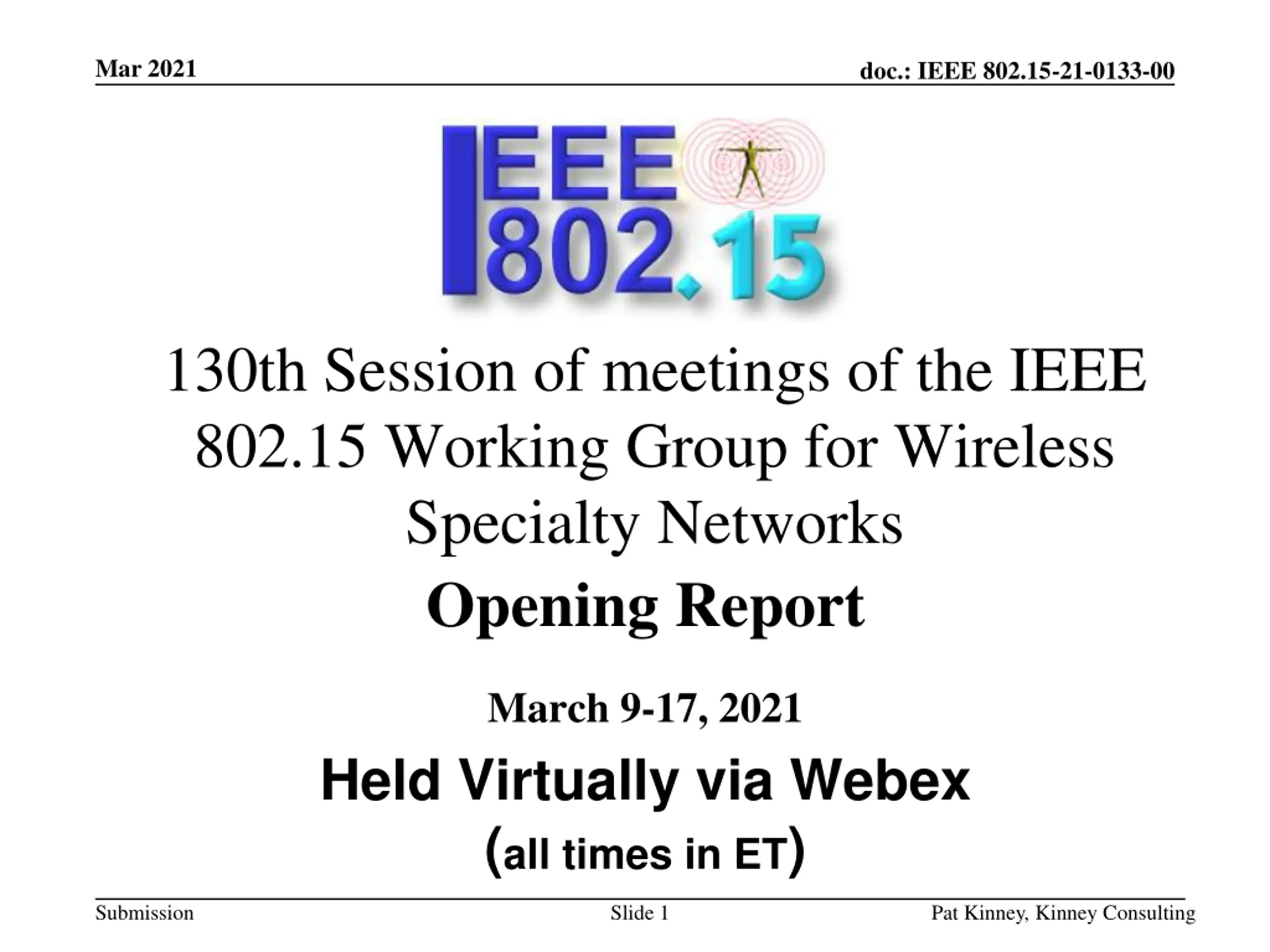 Mar 2021 doc.: IEEE 802.15-21-0133-00 130th Session of meetings of the IEEE 802.15 Working Group for Wireless Specialty Networks Opening Report March 9-17, 2021 Held Virtually via Webex (all times in ET) Submission Slide 1 Pat Kinney, Kinney Consulting