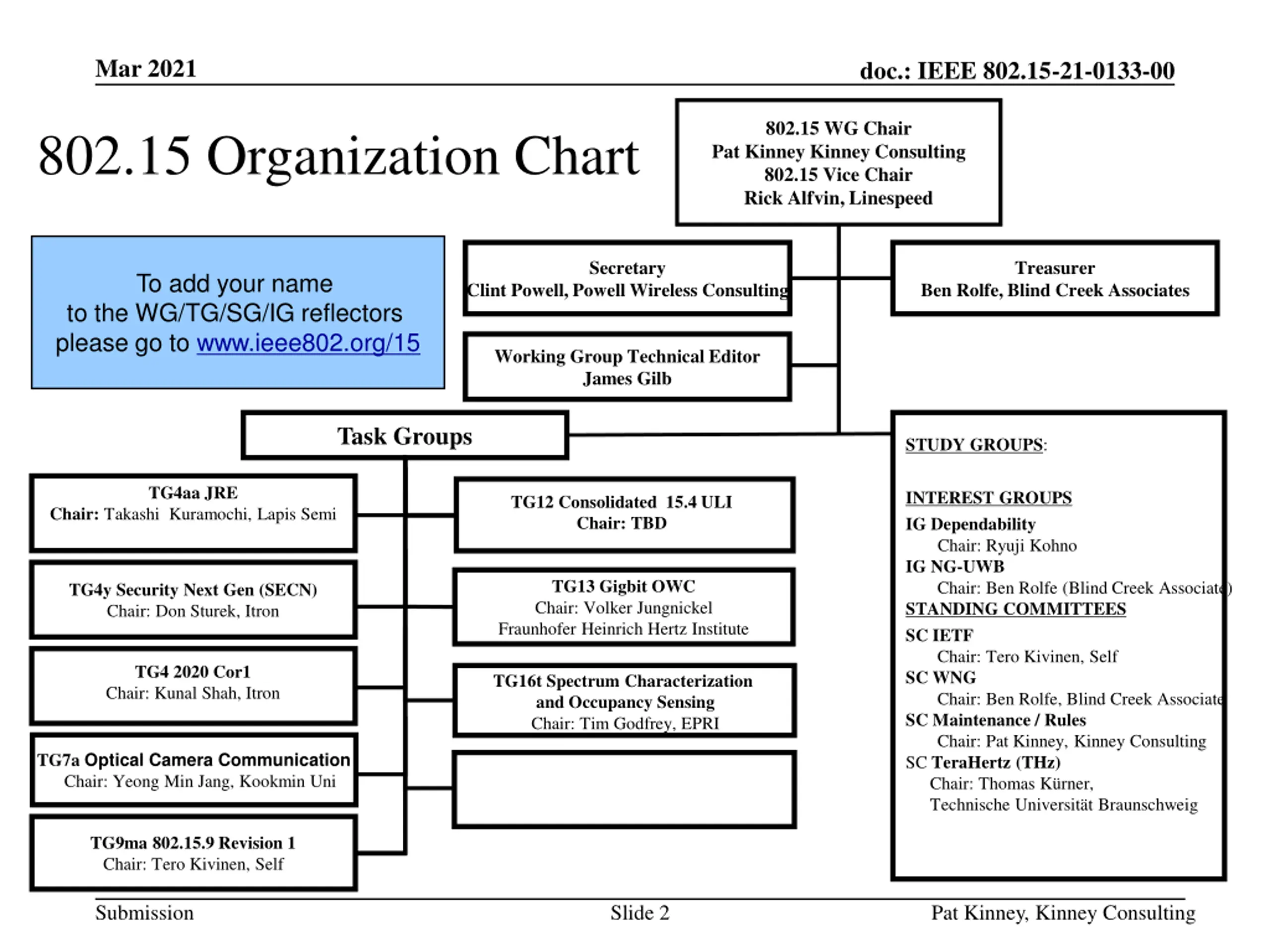 Mar 2021 doc.: IEEE 802.15-21-0133-00 802.15 WG Chair Pat Kinney Kinney Consulting 802.15 Vice Chair Rick Alfvin, Linespeed 802.15 Organization Chart Secretary Treasurer To add your name to the WG/TG/SG/IG reflectors please go to www.ieee802.org/15 Clint Powell, Powell Wireless Consulting Ben Rolfe, Blind Creek Associates Working Group Technical Editor James Gilb Task Groups STUDY GROUPS: TG4aa JRE INTEREST GROUPS IG Dependability Chair: Ryuji Kohno IG NG-UWB Chair: Ben Rolfe (Blind Creek Associate) STANDING COMMITTEES SC IETF Chair: Tero Kivinen, Self SC WNG Chair: Ben Rolfe, Blind Creek Associate SC Maintenance / Rules Chair: Pat Kinney, Kinney Consulting SC TeraHertz (THz) Chair: Thomas K rner, Technische Universit t Braunschweig TG12 Consolidated 15.4 ULI Chair: TBD Chair: Takashi Kuramochi, Lapis Semi TG13 Gigbit OWC Chair: Volker Jungnickel Fraunhofer Heinrich Hertz Institute TG4y Security Next Gen (SECN) Chair: Don Sturek, Itron TG4 2020 Cor1 Chair: Kunal Shah, Itron TG16t Spectrum Characterization and Occupancy Sensing Chair: Tim Godfrey, EPRI TG7a Optical Camera Communication Chair: Yeong Min Jang, Kookmin Uni TG9ma 802.15.9 Revision 1 Chair: Tero Kivinen, Self Submission Slide 2 Pat Kinney, Kinney Consulting