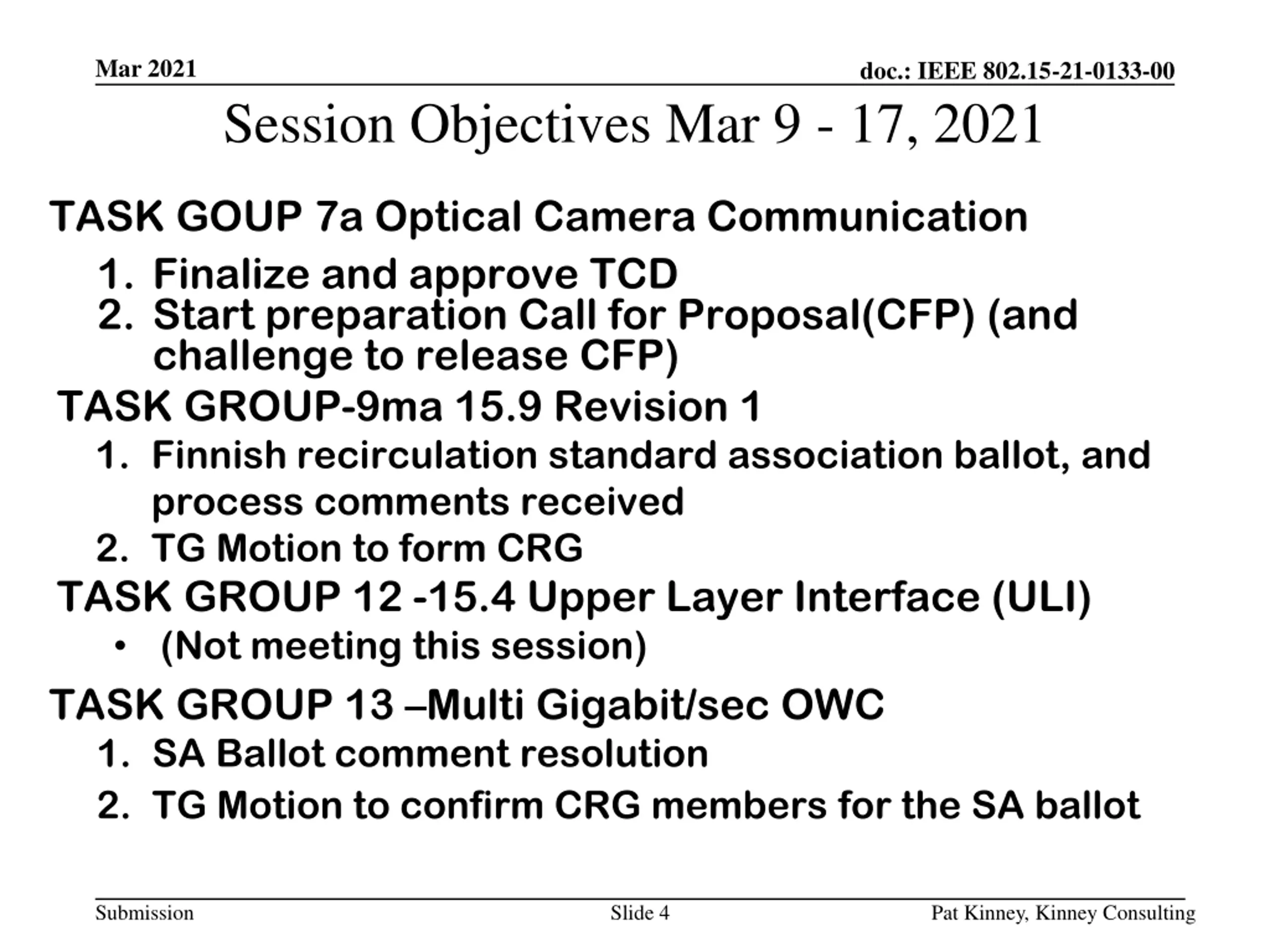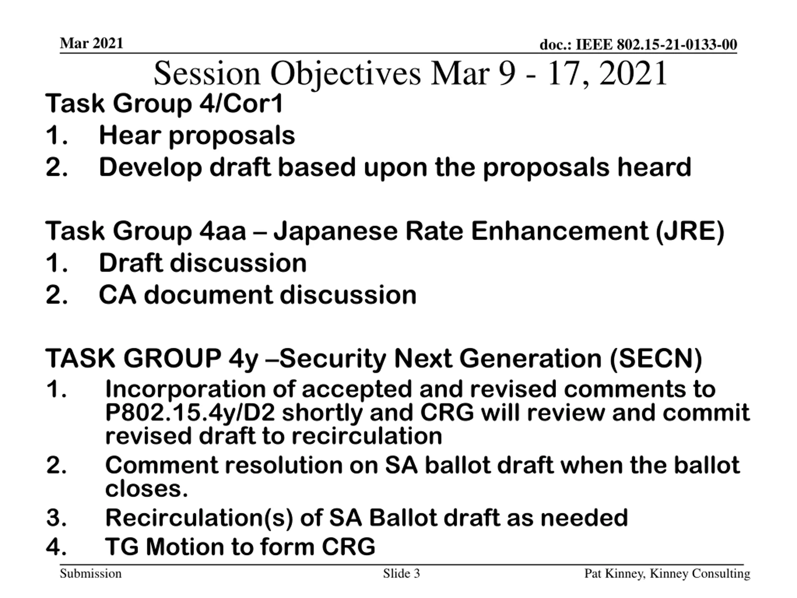 Mar 2021 doc.: IEEE 802.15-21-0133-00 Session Objectives Mar 9 - 17, 2021 Task Group 4/Cor1 1. Hear proposals 2. Develop draft based upon the proposals heard Task Group 4aa Japanese Rate Enhancement (JRE) 1. Draft discussion 2. CA document discussion TASK GROUP 4y Security Next Generation (SECN) 1. Incorporation of accepted and revised comments to P802.15.4y/D2 shortly and CRG will review and commit revised draft to recirculation 2. Comment resolution on SA ballot draft when the ballot closes. 3. Recirculation(s) of SA Ballot draft as needed 4. TG Motion to form CRG Submission Slide 3 Pat Kinney, Kinney Consulting