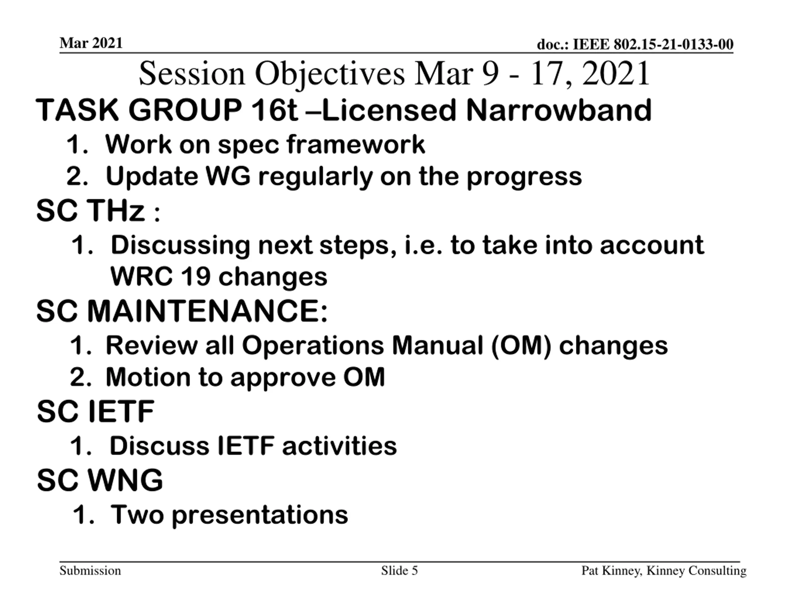 Mar 2021 doc.: IEEE 802.15-21-0133-00 Session Objectives Mar 9 - 17, 2021 TASK GROUP 16t Licensed Narrowband 1. Work on spec framework 2. Update WG regularly on the progress SC THz : 1. Discussing next steps, i.e. to take into account WRC 19 changes SC MAINTENANCE: 1. Review all Operations Manual (OM) changes 2. Motion to approve OM SC IETF 1. Discuss IETF activities SC WNG 1. Two presentations Submission Slide 5 Pat Kinney, Kinney Consulting