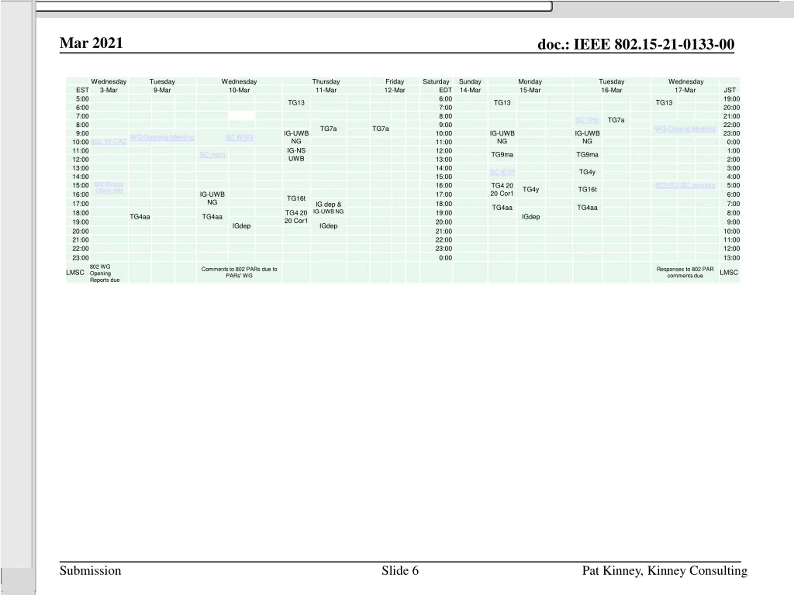 Mar 2021 doc.: IEEE 802.15-21-0133-00 Wednesday 3-Mar Tuesday 9-Mar Wednesday 10-Mar Thursday 11-Mar Friday 12-Mar Saturday Sunday 14-Mar Monday 15-Mar Tuesday 16-Mar Wednesday 17-Mar EST 5:00 6:00 7:00 8:00 9:00 10:00 802.15 CAC 11:00 12:00 13:00 14:00 15:00 Chairs mtg 16:00 17:00 18:00 19:00 20:00 21:00 22:00 23:00 802 WG Opening Reports due EDT 6:00 7:00 8:00 9:00 10:00 11:00 12:00 13:00 14:00 15:00 16:00 17:00 18:00 19:00 20:00 21:00 22:00 23:00 0:00 JST 19:00 20:00 21:00 22:00 23:00 0:00 1:00 2:00 3:00 4:00 5:00 6:00 7:00 8:00 9:00 10:00 11:00 12:00 13:00 TG13 TG13 TG13 SC THz TG7a TG7a TG7a WG Closing Meeting IG-UWB NG IG-NS UWB IG-UWB NG IG-UWB NG WG Opening Meeting SC WNG SC main TG9ma TG9ma SC IETF TG4y 802 Wirless 802/ITU SC meeting TG4 20 20 Cor1 TG4y TG16t IG-UWB NG TG16t IG dep & IG-UWB NG TG4aa TG4aa TG4 20 20 Cor1 TG4aa TG4aa IGdep IGdep IGdep Comments to 802 PARs due to PARs' WG Responses to 802 PAR comments due LMSC LMSC Submission Slide 6 Pat Kinney, Kinney Consulting
