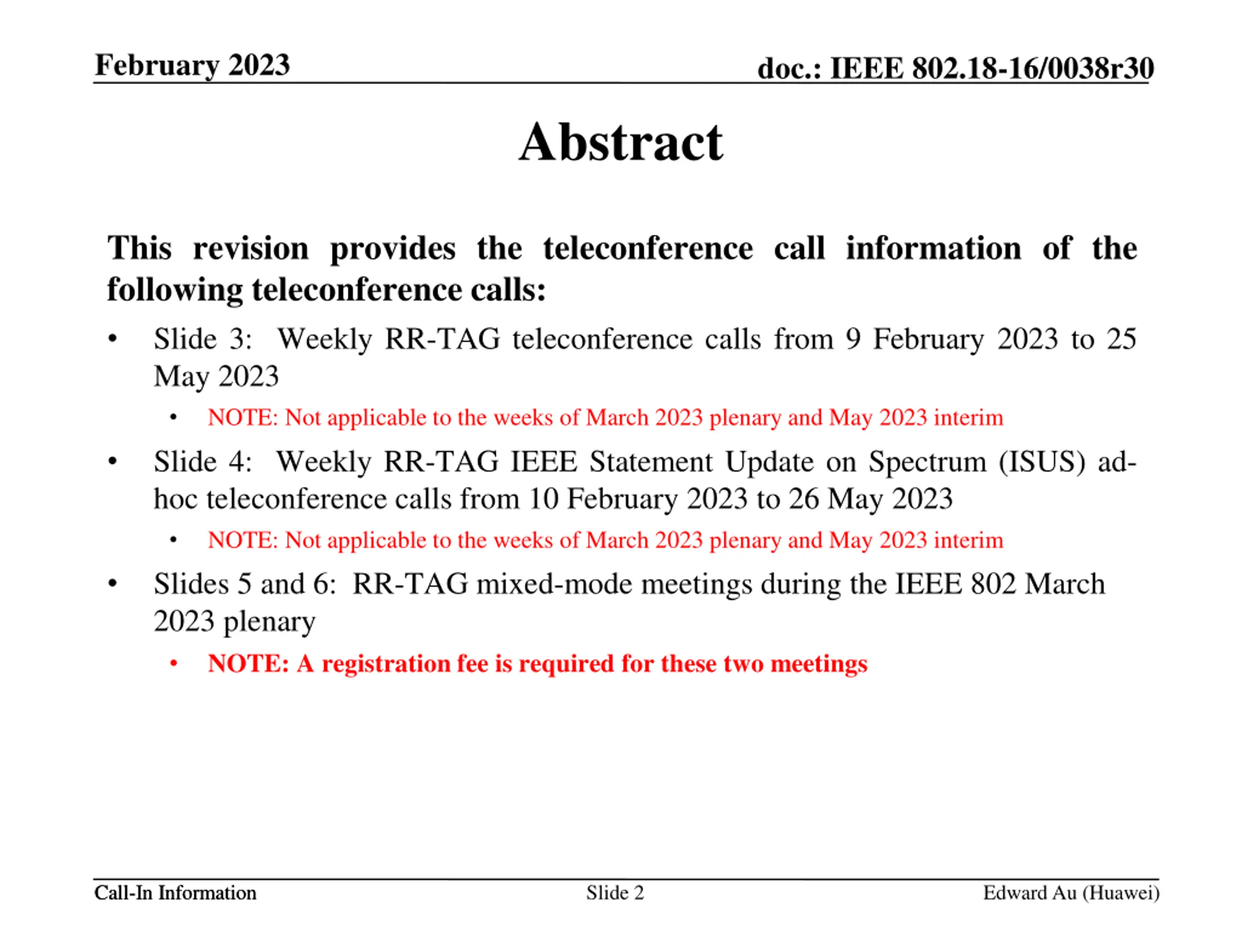 February 2023 doc.: IEEE 802.18-16/0038r30 Abstract This revision provides the teleconference call information of the following teleconference calls: Slide 3: Weekly RR-TAG teleconference calls from 9 February 2023 to 25 May 2023 NOTE: Not applicable to the weeks of March 2023 plenary and May 2023 interim Slide 4: Weekly RR-TAG IEEE Statement Update on Spectrum (ISUS) ad- hoc teleconference calls from 10 February 2023 to 26 May 2023 NOTE: Not applicable to the weeks of March 2023 plenary and May 2023 interim Slides 5 and 6: RR-TAG mixed-mode meetings during the IEEE 802 March 2023 plenary NOTE: A registration fee is required for these two meetings Call-In Information Call-In Information Slide 2 Edward Au (Huawei) Jay Holcomb (Itron)