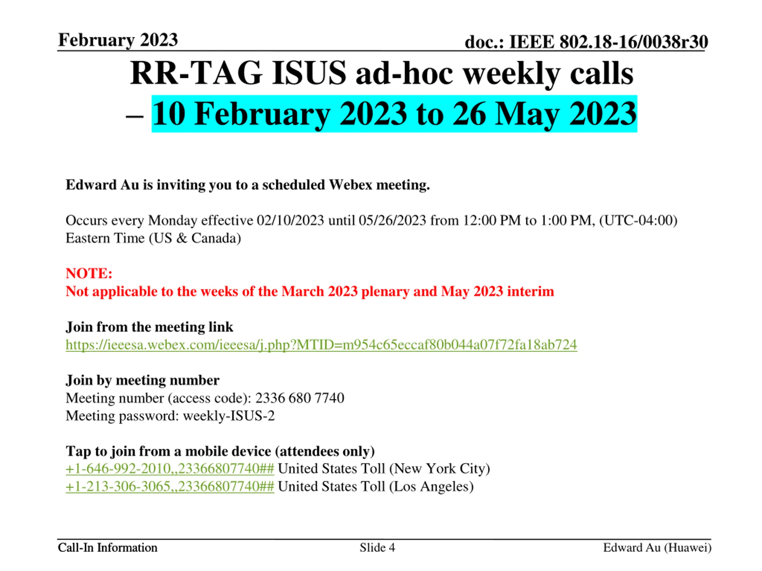 February 2023 doc.: IEEE 802.18-16/0038r30 RR-TAG ISUS ad-hoc weekly calls 10 February 2023 to 26 May 2023 Edward Au is inviting you to a scheduled Webex meeting. Occurs every Monday effective 02/10/2023 until 05/26/2023 from 12:00 PM to 1:00 PM, (UTC-04:00) Eastern Time (US & Canada) NOTE: Not applicable to the weeks of the March 2023 plenary and May 2023 interim Join from the meeting link https://ieeesa.webex.com/ieeesa/j.php?MTID=m954c65eccaf80b044a07f72fa18ab724 Join by meeting number Meeting number (access code): 2336 680 7740 Meeting password: weekly-ISUS-2 Tap to join from a mobile device (attendees only) +1-646-992-2010,,23366807740## United States Toll (New York City) +1-213-306-3065,,23366807740## United States Toll (Los Angeles) Call-In Information Call-In Information Slide 4 Edward Au (Huawei) Jay Holcomb (Itron)