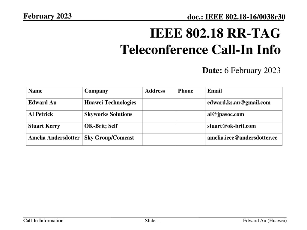 February 2023 doc.: IEEE 802.18-16/0038r30 IEEE 802.18 RR-TAG Teleconference Call-In Info Date: 6 February 2023 Name Company Address Phone Email Edward Au Huawei Technologies edward.ks.au@gmail.com Al Petrick Skyworks Solutions al@jpasoc.com Stuart Kerry OK-Brit; Self stuart@ok-brit.com Amelia Andersdotter Sky Group/Comcast amelia.ieee@andersdotter.cc Call-In Information Call-In Information Slide 1 Edward Au (Huawei) Jay Holcomb (Itron)