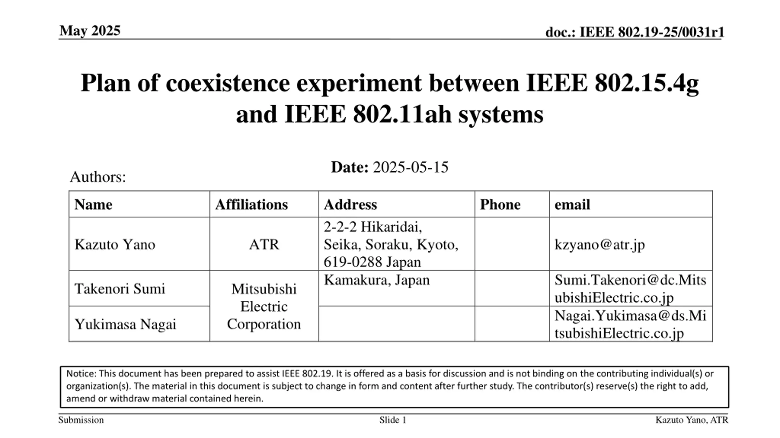 May 2025 doc.: IEEE 802.19-25/0031r1 Plan of coexistence experiment between IEEE 802.15.4g and IEEE 802.11ah systems Date: 2025-05-15 Authors: Name Affiliations Address 2-2-2 Hikaridai, Seika, Soraku, Kyoto, 619-0288 Japan Kamakura, Japan Phone email Kazuto Yano ATR kzyano@atr.jp Sumi.Takenori@dc.Mits ubishiElectric.co.jp Nagai.Yukimasa@ds.Mi tsubishiElectric.co.jp Takenori Sumi Mitsubishi Electric Corporation Yukimasa Nagai Notice: This document has been prepared to assist IEEE 802.19. It is offered as a basis for discussion and is not binding on the contributing individual(s) or organization(s). The material in this document is subject to change in form and content after further study. The contributor(s) reserve(s) the right to add, amend or withdraw material contained herein. Submission Slide 1 Kazuto Yano, ATR