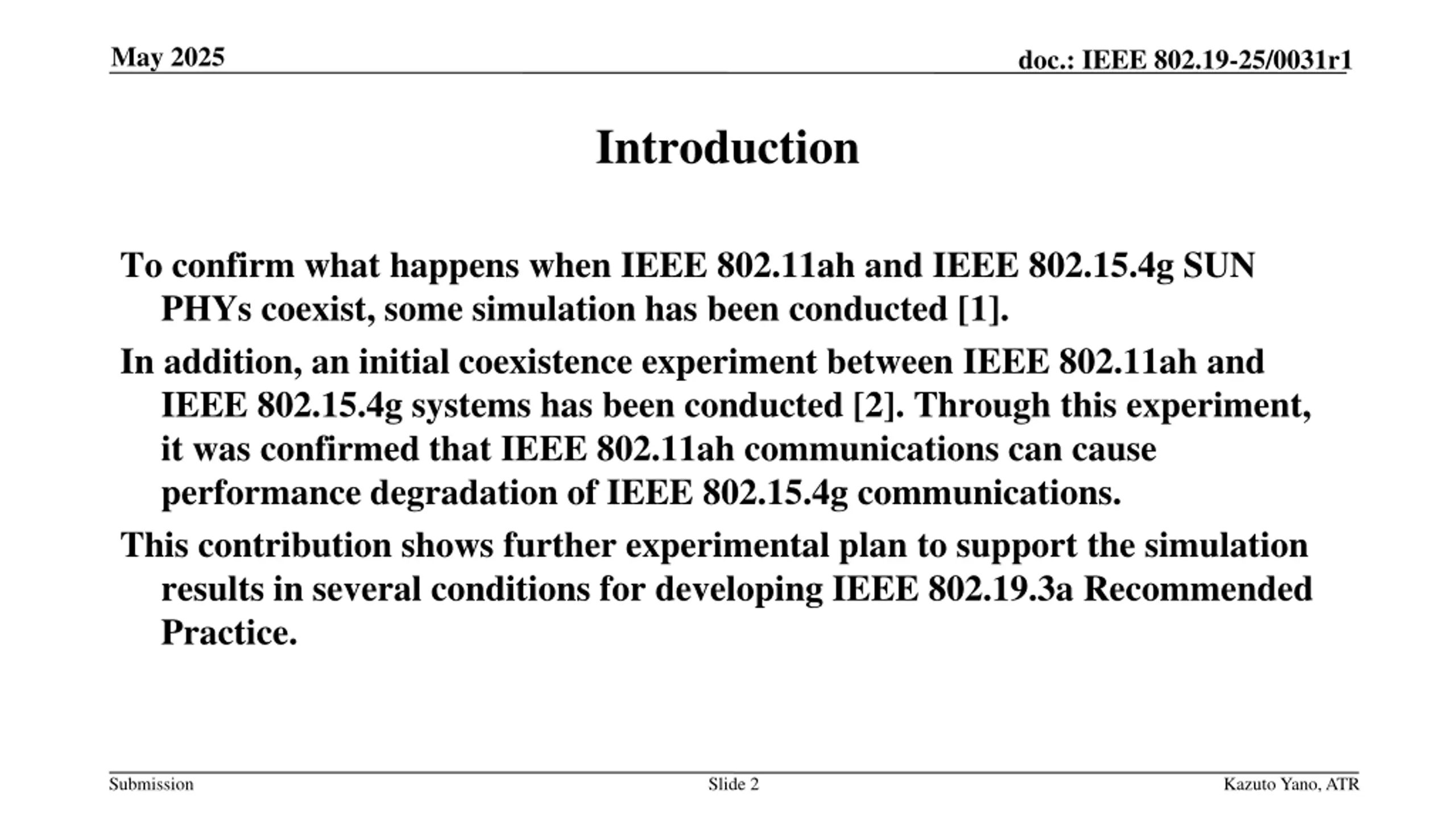 May 2025 doc.: IEEE 802.19-25/0031r1 Introduction To confirm what happens when IEEE 802.11ah and IEEE 802.15.4g SUN PHYs coexist, some simulation has been conducted [1]. In addition, an initial coexistence experiment between IEEE 802.11ah and IEEE 802.15.4g systems has been conducted [2]. Through this experiment, it was confirmed that IEEE 802.11ah communications can cause performance degradation of IEEE 802.15.4g communications. This contribution shows further experimental plan to support the simulation results in several conditions for developing IEEE 802.19.3a Recommended Practice. Submission Slide 2 Kazuto Yano, ATR