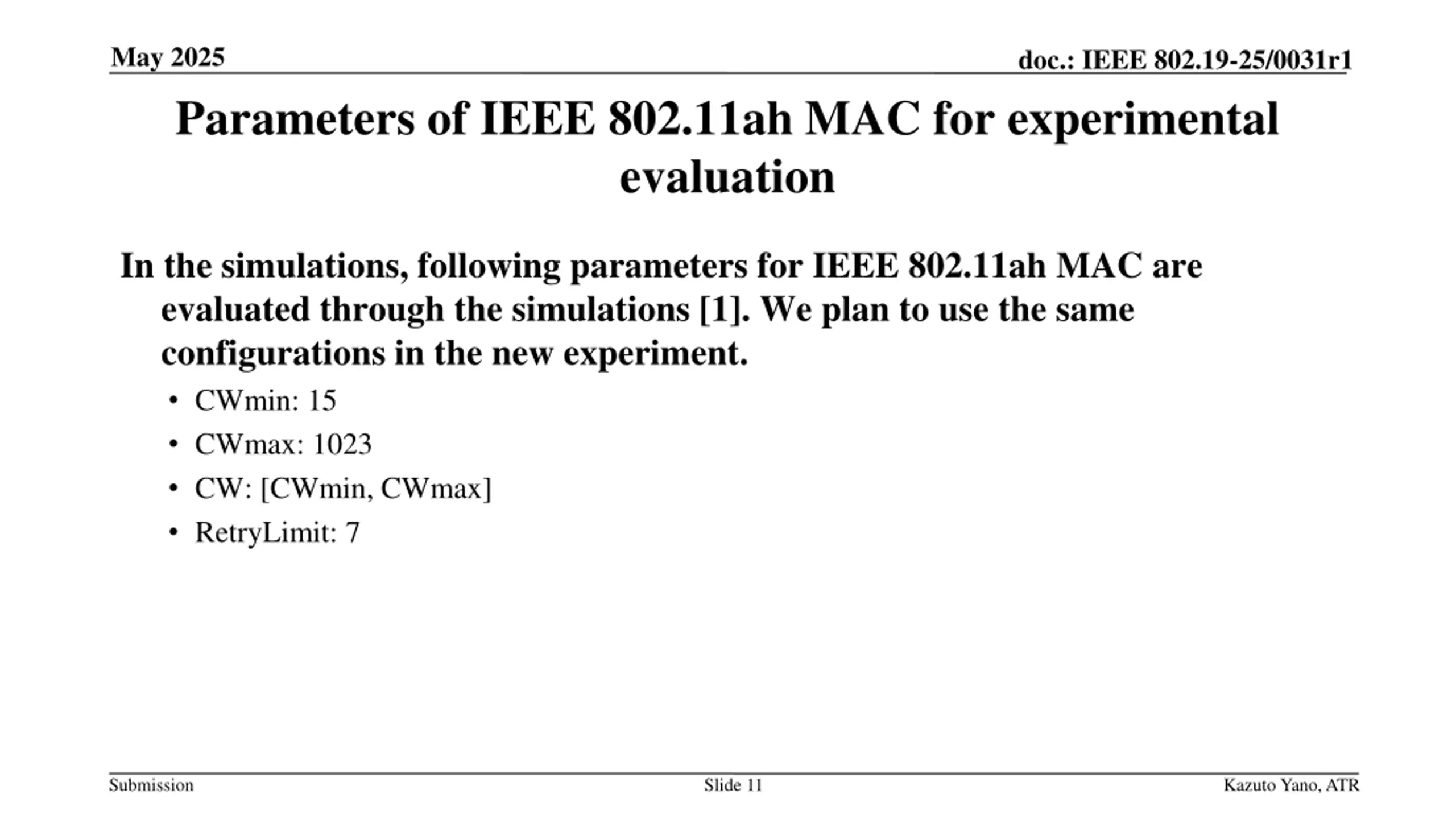 May 2025 doc.: IEEE 802.19-25/0031r1 Parameters of IEEE 802.11ah MAC for experimental evaluation In the simulations, following parameters for IEEE 802.11ah MAC are evaluated through the simulations [1]. We plan to use the same configurations in the new experiment. CWmin: 15 CWmax: 1023 CW: [CWmin, CWmax] RetryLimit: 7 Submission Slide 11 Kazuto Yano, ATR