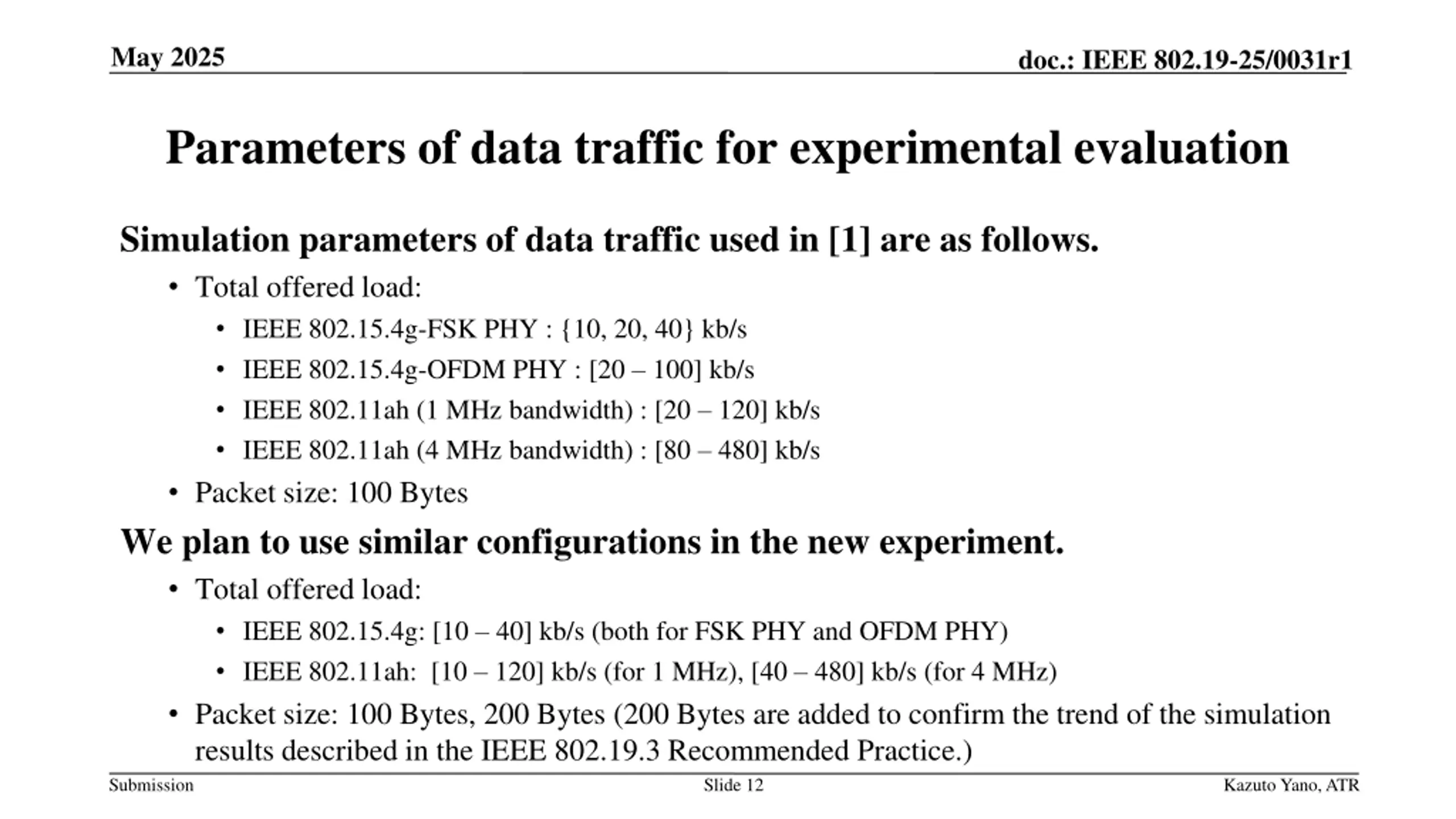 May 2025 doc.: IEEE 802.19-25/0031r1 Parameters of data traffic for experimental evaluation Simulation parameters of data traffic used in [1] are as follows. Total offered load: IEEE 802.15.4g-FSK PHY : {10, 20, 40} kb/s IEEE 802.15.4g-OFDM PHY : [20 100] kb/s IEEE 802.11ah (1 MHz bandwidth) : [20 120] kb/s IEEE 802.11ah (4 MHz bandwidth) : [80 480] kb/s Packet size: 100 Bytes We plan to use similar configurations in the new experiment. Total offered load: IEEE 802.15.4g: [10 40] kb/s (both for FSK PHY and OFDM PHY) IEEE 802.11ah: [10 120] kb/s (for 1 MHz), [40 480] kb/s (for 4 MHz) Packet size: 100 Bytes, 200 Bytes (200 Bytes are added to confirm the trend of the simulation results described in the IEEE 802.19.3 Recommended Practice.) Slide 12 Submission Kazuto Yano, ATR