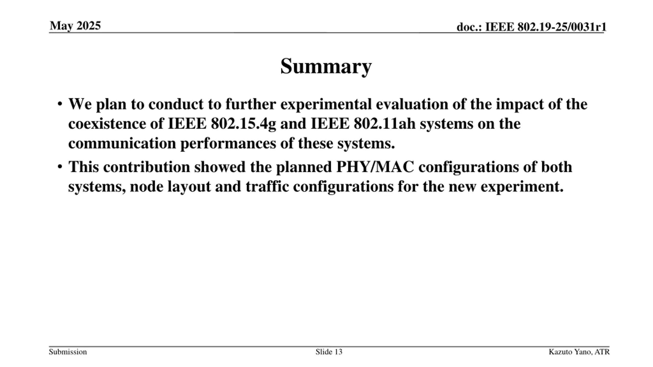 May 2025 doc.: IEEE 802.19-25/0031r1 Summary We plan to conduct to further experimental evaluation of the impact of the coexistence of IEEE 802.15.4g and IEEE 802.11ah systems on the communication performances of these systems. This contribution showed the planned PHY/MAC configurations of both systems, node layout and traffic configurations for the new experiment. Submission Slide 13 Kazuto Yano, ATR