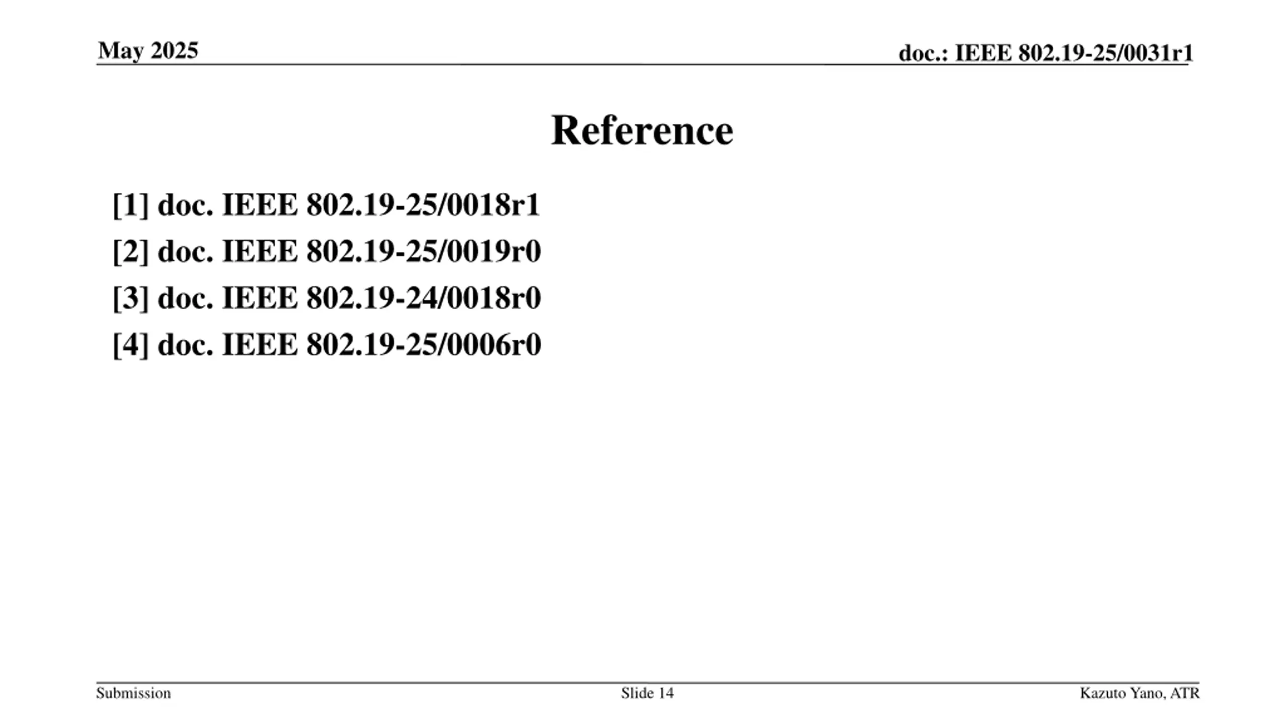 May 2025 doc.: IEEE 802.19-25/0031r1 Reference [1] doc. IEEE 802.19-25/0018r1 [2] doc. IEEE 802.19-25/0019r0 [3] doc. IEEE 802.19-24/0018r0 [4] doc. IEEE 802.19-25/0006r0 Submission Slide 14 Kazuto Yano, ATR