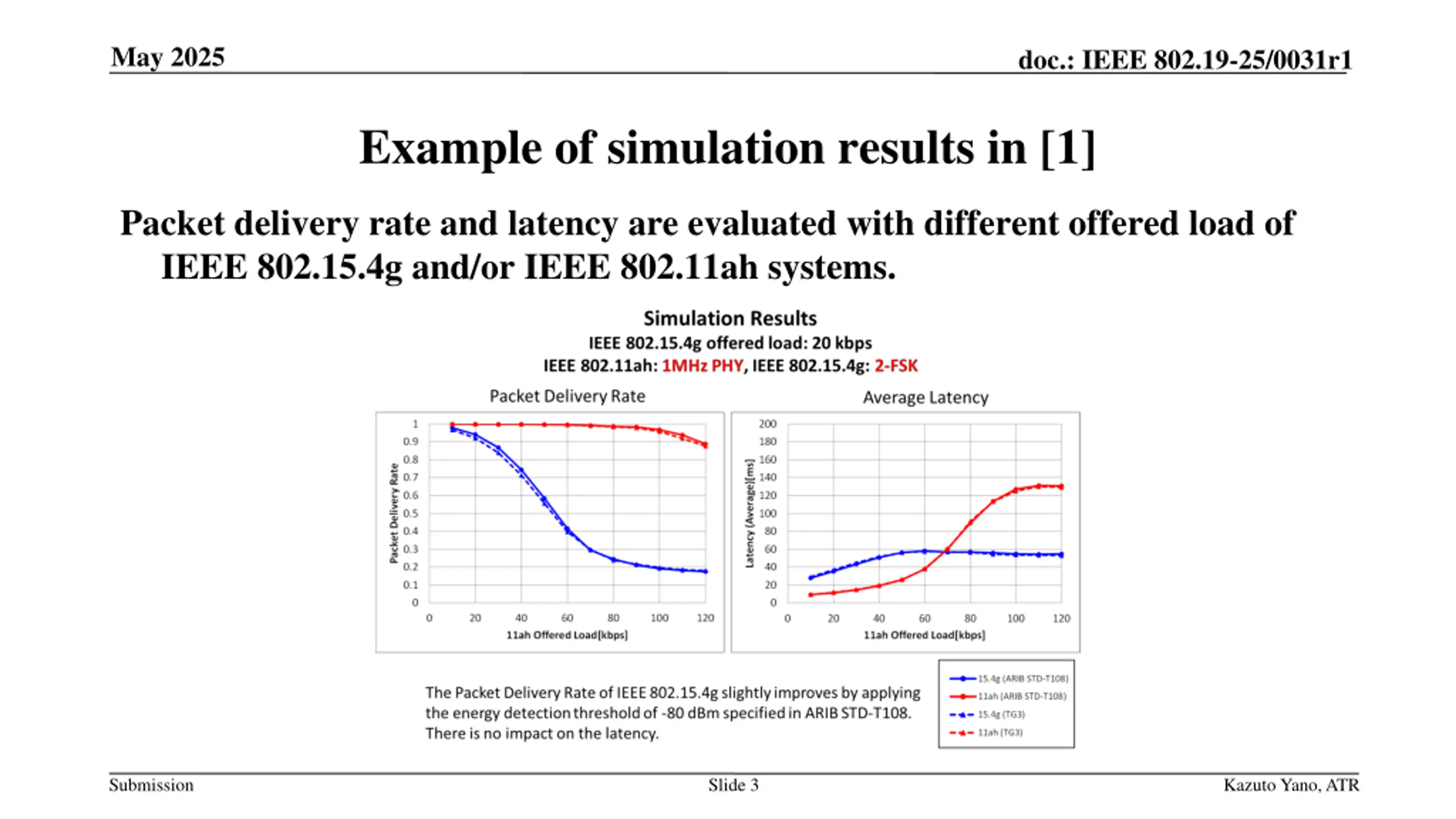 May 2025 doc.: IEEE 802.19-25/0031r1 Example of simulation results in [1] Packet delivery rate and latency are evaluated with different offered load of IEEE 802.15.4g and/or IEEE 802.11ah systems. Submission Slide 3 Kazuto Yano, ATR