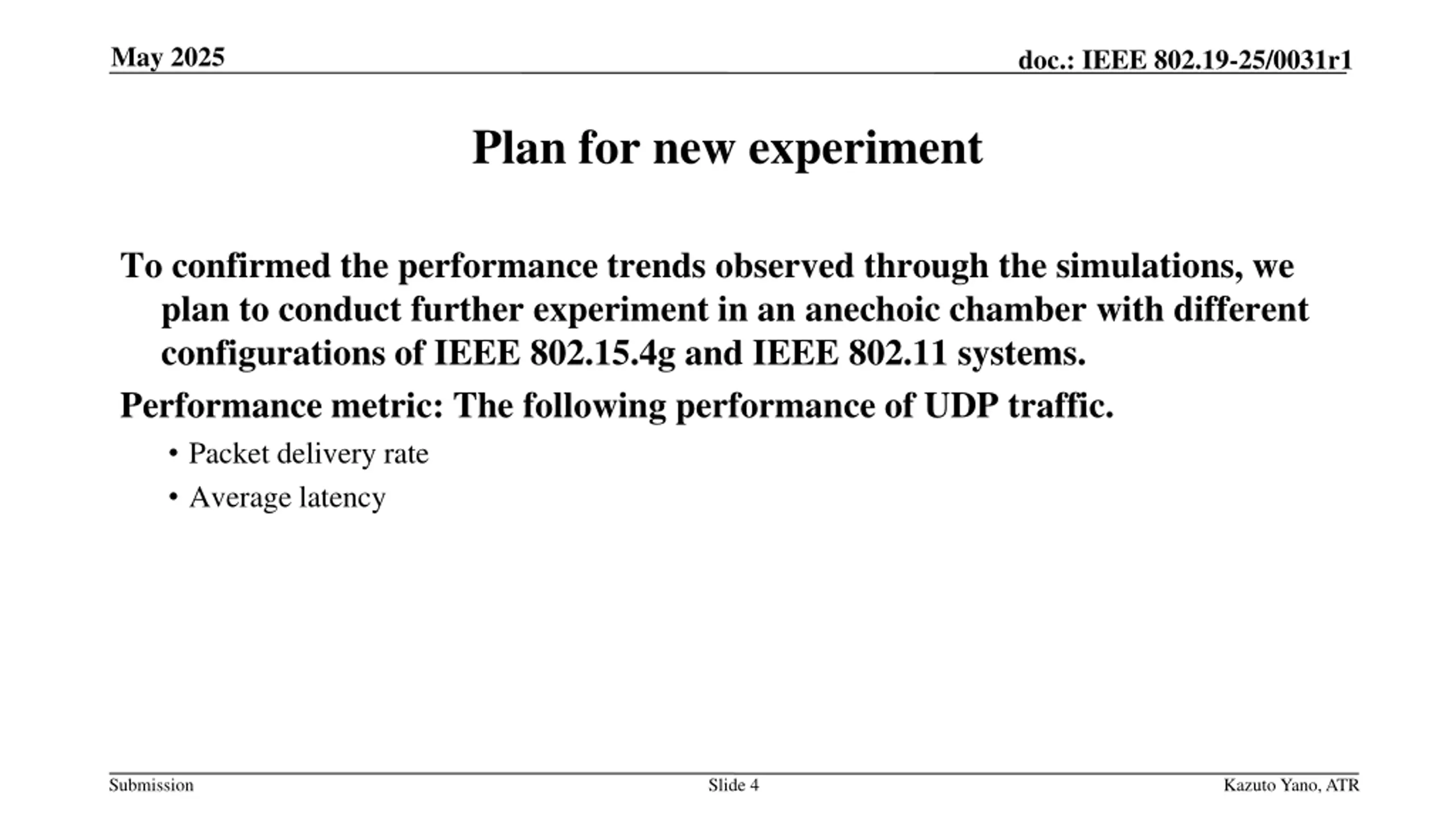 May 2025 doc.: IEEE 802.19-25/0031r1 Plan for new experiment To confirmed the performance trends observed through the simulations, we plan to conduct further experiment in an anechoic chamber with different configurations of IEEE 802.15.4g and IEEE 802.11 systems. Performance metric: The following performance of UDP traffic. Packet delivery rate Average latency Submission Slide 4 Kazuto Yano, ATR