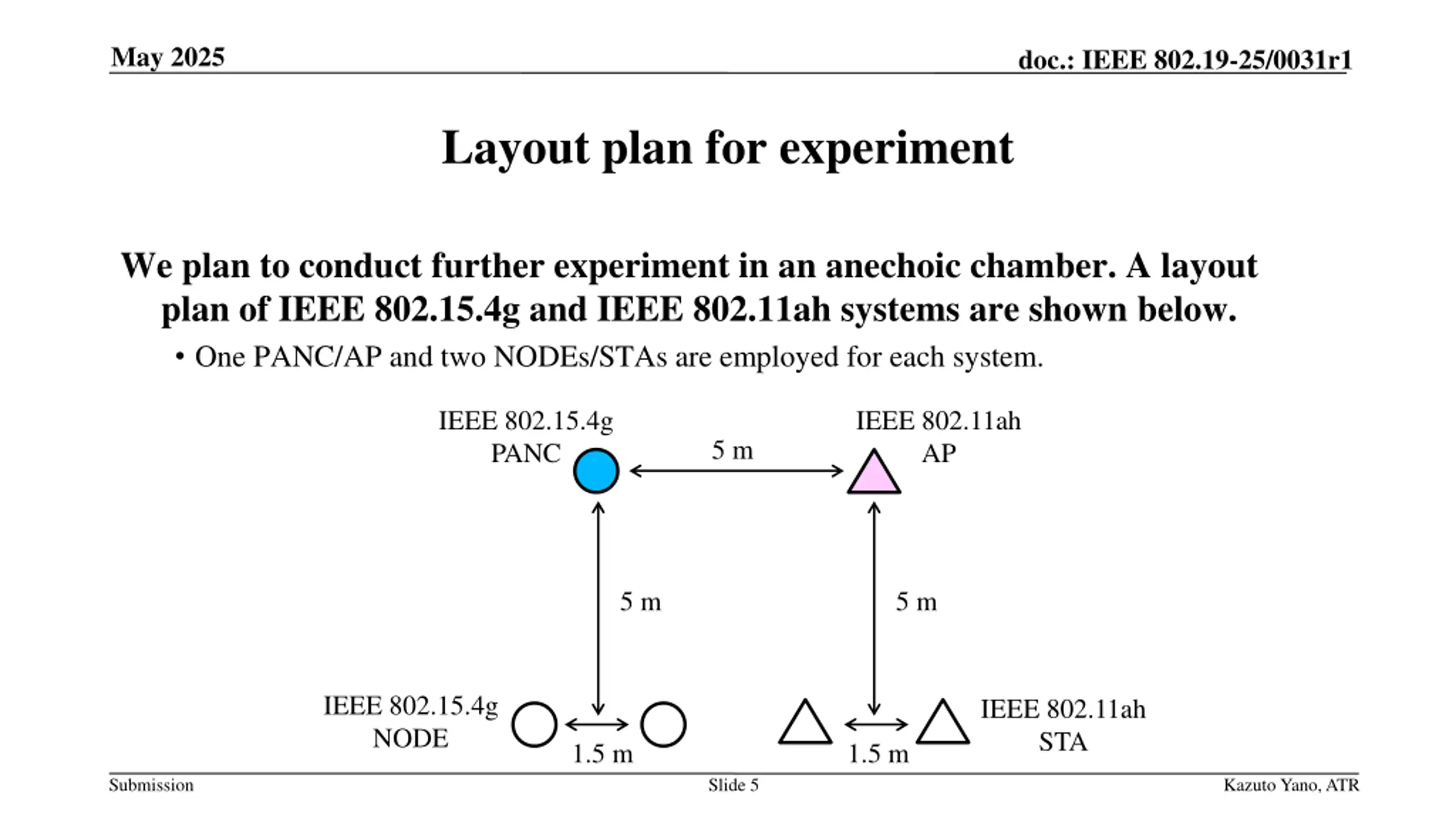 May 2025 doc.: IEEE 802.19-25/0031r1 Layout plan for experiment We plan to conduct further experiment in an anechoic chamber. A layout plan of IEEE 802.15.4g and IEEE 802.11ah systems are shown below. One PANC/AP and two NODEs/STAs are employed for each system. IEEE 802.15.4g PANC IEEE 802.11ah AP 5 m 5 m 5 m IEEE 802.15.4g NODE IEEE 802.11ah STA 1.5 m 1.5 m Submission Slide 5 Kazuto Yano, ATR