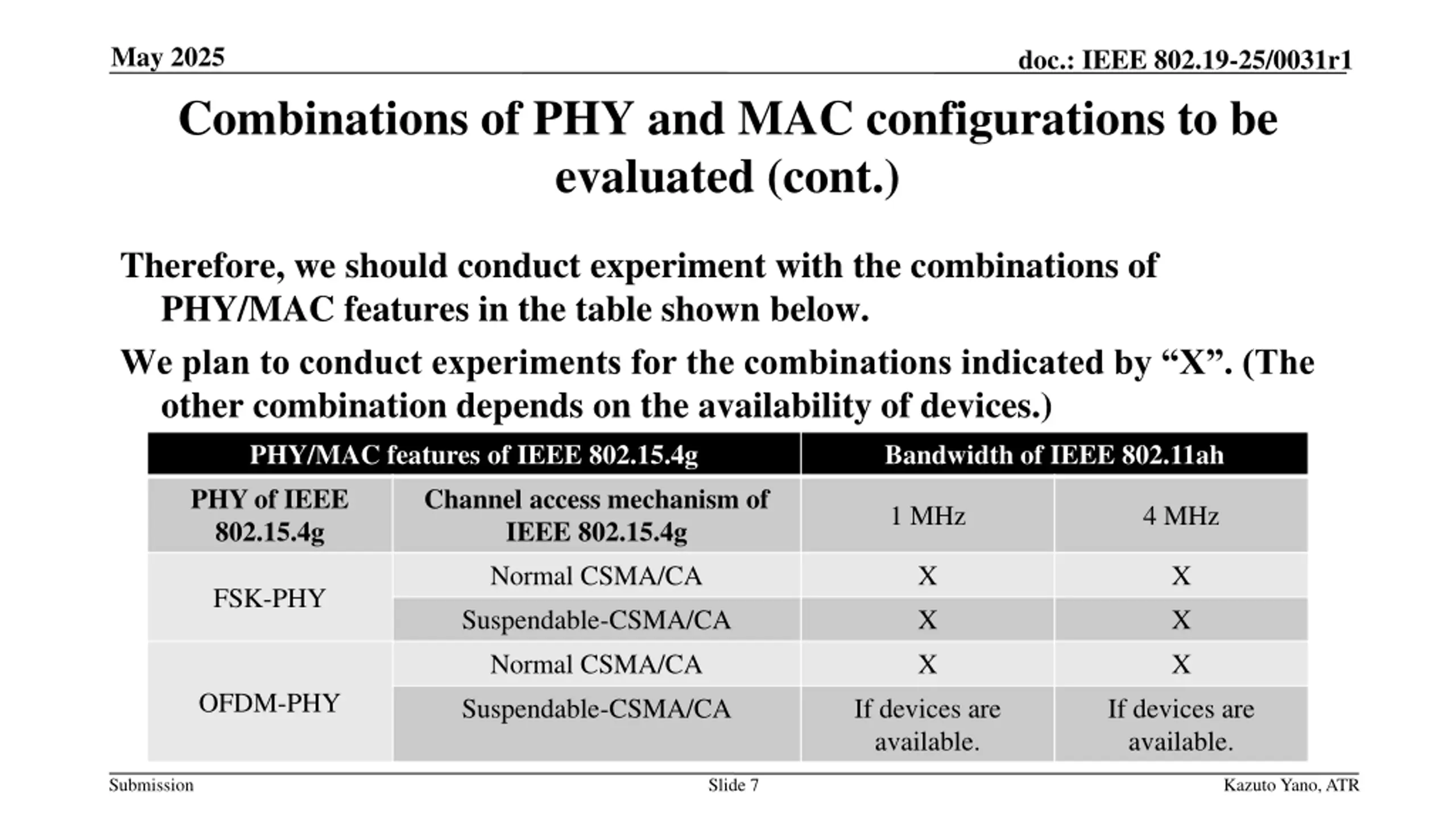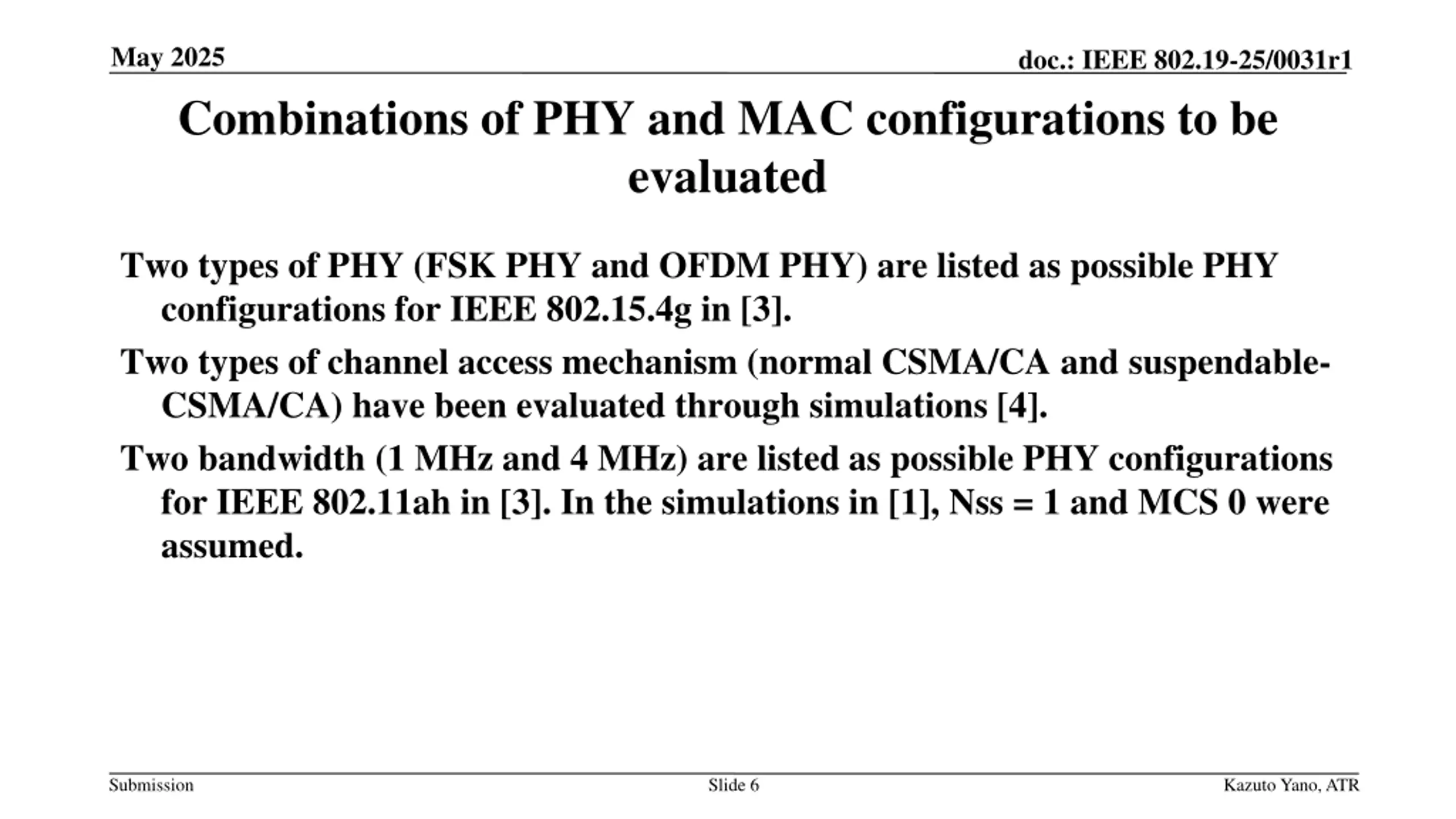 May 2025 doc.: IEEE 802.19-25/0031r1 Combinations of PHY and MAC configurations to be evaluated Two types of PHY (FSK PHY and OFDM PHY) are listed as possible PHY configurations for IEEE 802.15.4g in [3]. Two types of channel access mechanism (normal CSMA/CA and suspendable- CSMA/CA) have been evaluated through simulations [4]. Two bandwidth (1 MHz and 4 MHz) are listed as possible PHY configurations for IEEE 802.11ah in [3]. In the simulations in [1], Nss = 1 and MCS 0 were assumed. Submission Slide 6 Kazuto Yano, ATR
