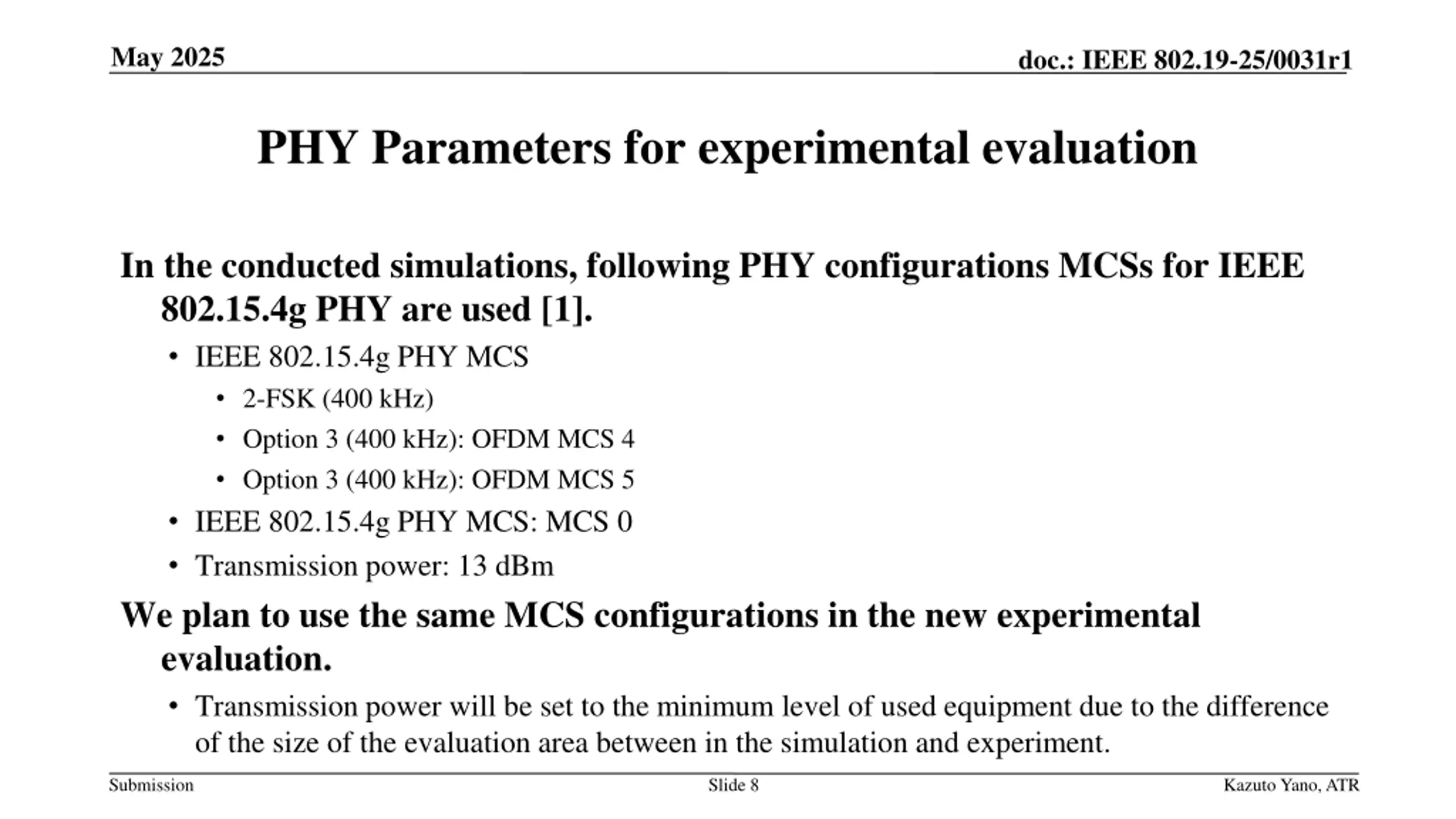 May 2025 doc.: IEEE 802.19-25/0031r1 PHY Parameters for experimental evaluation In the conducted simulations, following PHY configurations MCSs for IEEE 802.15.4g PHY are used [1]. IEEE 802.15.4g PHY MCS 2-FSK (400 kHz) Option 3 (400 kHz): OFDM MCS 4 Option 3 (400 kHz): OFDM MCS 5 IEEE 802.15.4g PHY MCS: MCS 0 Transmission power: 13 dBm We plan to use the same MCS configurations in the new experimental evaluation. Transmission power will be set to the minimum level of used equipment due to the difference of the size of the evaluation area between in the simulation and experiment. Submission Slide 8 Kazuto Yano, ATR