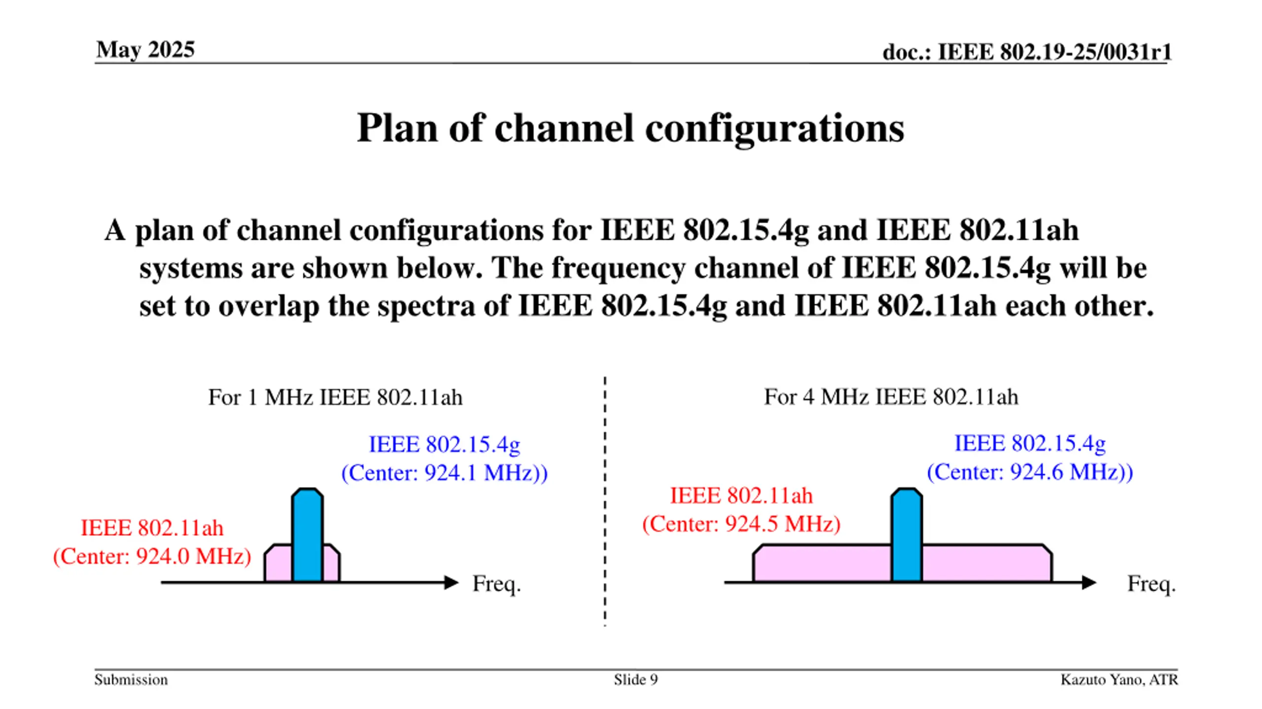May 2025 doc.: IEEE 802.19-25/0031r1 Plan of channel configurations A plan of channel configurations for IEEE 802.15.4g and IEEE 802.11ah systems are shown below. The frequency channel of IEEE 802.15.4g will be set to overlap the spectra of IEEE 802.15.4g and IEEE 802.11ah each other. For 4 MHz IEEE 802.11ah For 1 MHz IEEE 802.11ah IEEE 802.15.4g (Center: 924.6 MHz)) IEEE 802.15.4g (Center: 924.1 MHz)) IEEE 802.11ah (Center: 924.5 MHz) IEEE 802.11ah (Center: 924.0 MHz) Freq. Freq. Submission Slide 9 Kazuto Yano, ATR