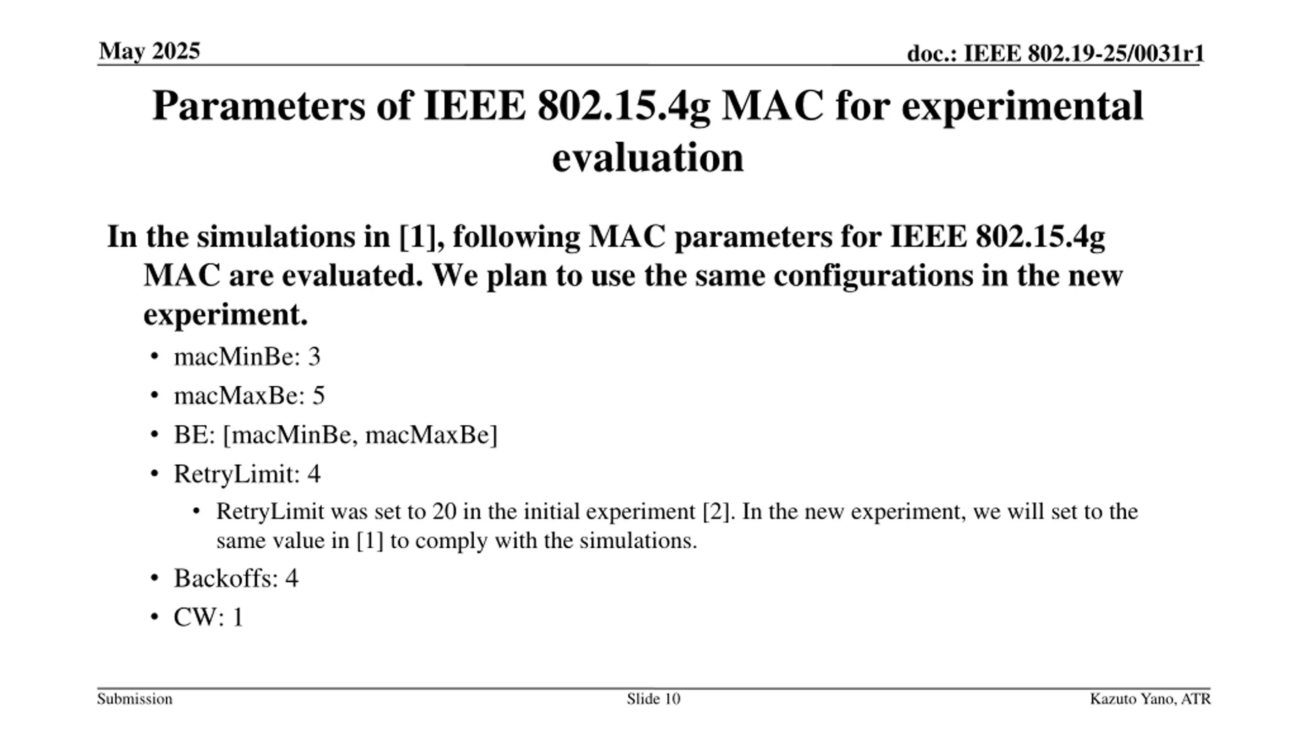May 2025 doc.: IEEE 802.19-25/0031r1 Parameters of IEEE 802.15.4g MAC for experimental evaluation In the simulations in [1], following MAC parameters for IEEE 802.15.4g MAC are evaluated. We plan to use the same configurations in the new experiment. macMinBe: 3 macMaxBe: 5 BE: [macMinBe, macMaxBe] RetryLimit: 4 RetryLimit was set to 20 in the initial experiment [2]. In the new experiment, we will set to the same value in [1] to comply with the simulations. Backoffs: 4 CW: 1 Submission Slide 10 Kazuto Yano, ATR