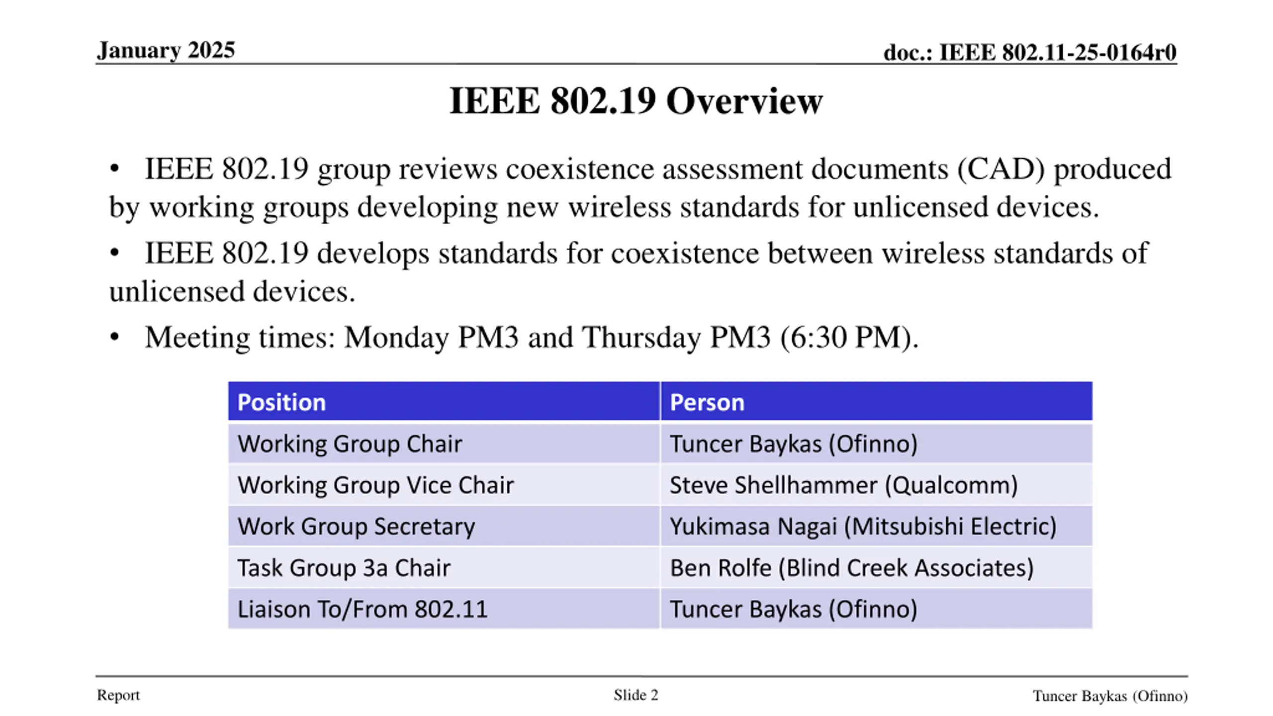 January 2025 doc.: IEEE 802.11-25-0164r0 IEEE 802.19 Overview IEEE 802.19 group reviews coexistence assessment documents (CAD) produced by working groups developing new wireless standards for unlicensed devices. IEEE 802.19 develops standards for coexistence between wireless standards of unlicensed devices. Meeting times: Monday PM3 and Thursday PM3 (6:30 PM). Position Person Working Group Chair Tuncer Baykas (Ofinno) Working Group Vice Chair Steve Shellhammer (Qualcomm) Work Group Secretary Yukimasa Nagai (Mitsubishi Electric) Task Group 3a Chair Ben Rolfe (Blind Creek Associates) Liaison To/From 802.11 Tuncer Baykas (Ofinno) Report Slide 2 Tuncer Baykas (Ofinno)