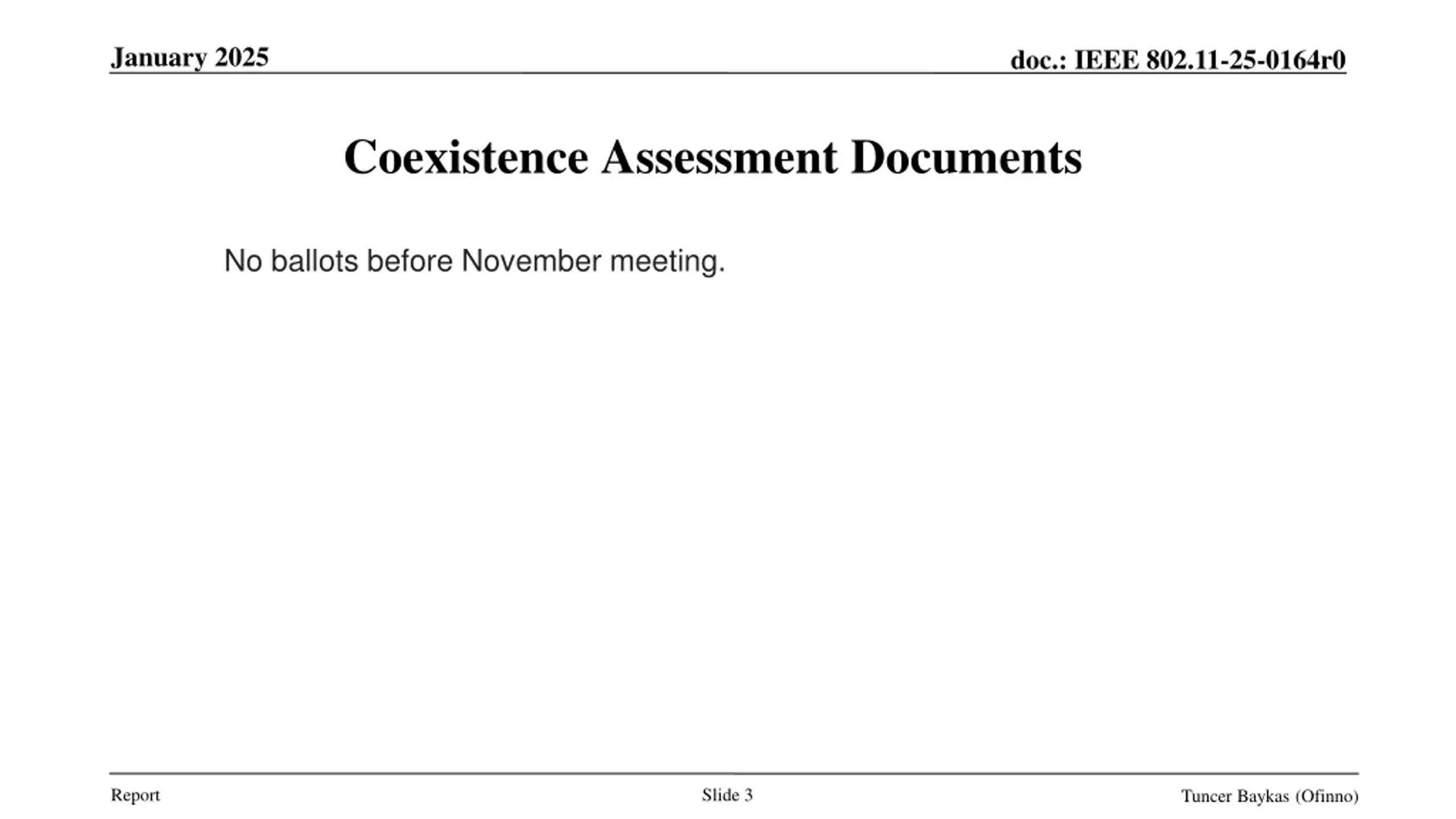 January 2025 doc.: IEEE 802.11-25-0164r0 Coexistence Assessment Documents No ballots before November meeting. Report Slide 3 Tuncer Baykas (Ofinno)