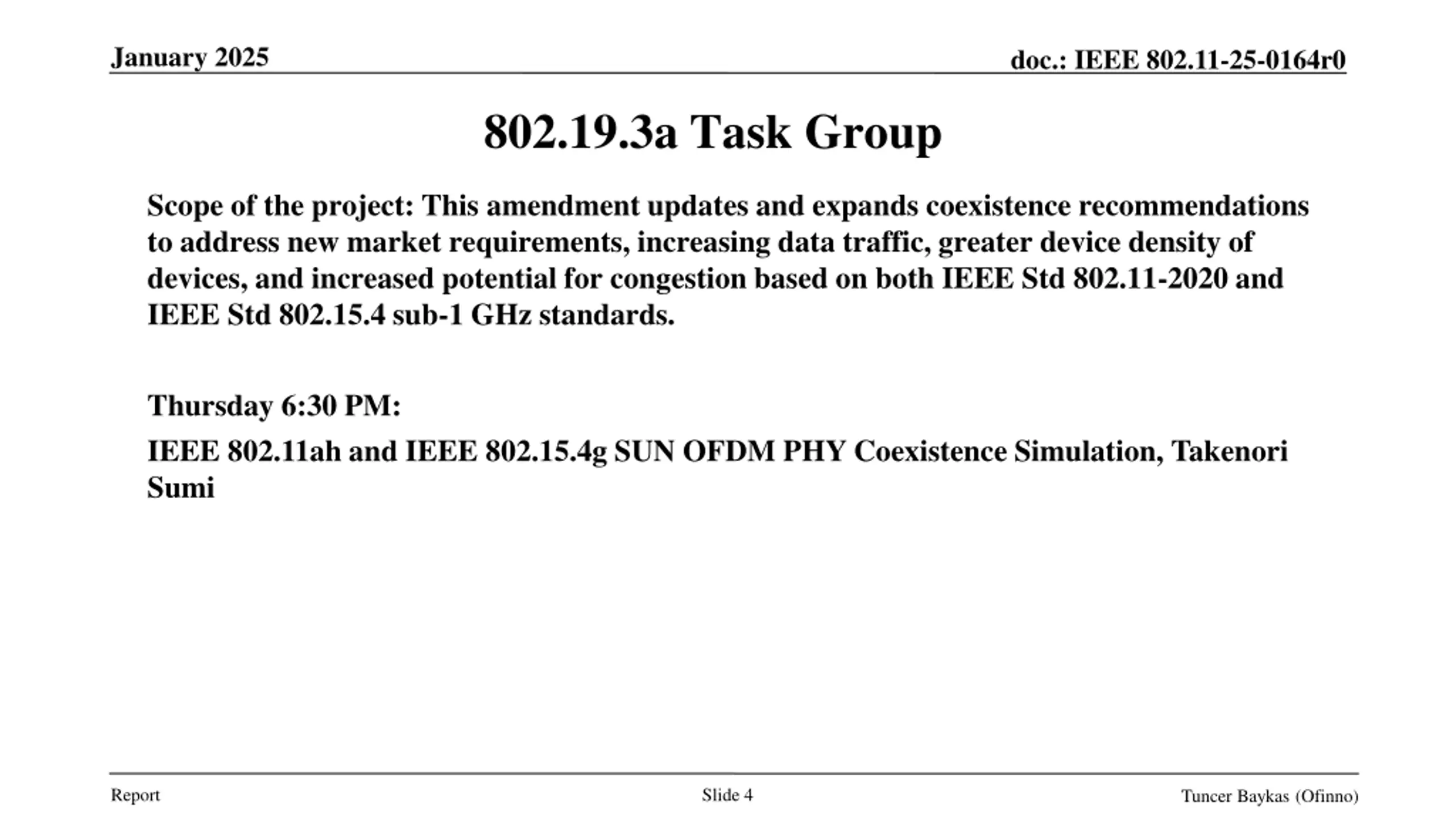 January 2025 doc.: IEEE 802.11-25-0164r0 802.19.3a Task Group Scope of the project: This amendment updates and expands coexistence recommendations to address new market requirements, increasing data traffic, greater device density of devices, and increased potential for congestion based on both IEEE Std 802.11-2020 and IEEE Std 802.15.4 sub-1 GHz standards. Thursday 6:30 PM: IEEE 802.11ah and IEEE 802.15.4g SUN OFDM PHY Coexistence Simulation,Takenori Sumi Report Slide 4 Tuncer Baykas (Ofinno)