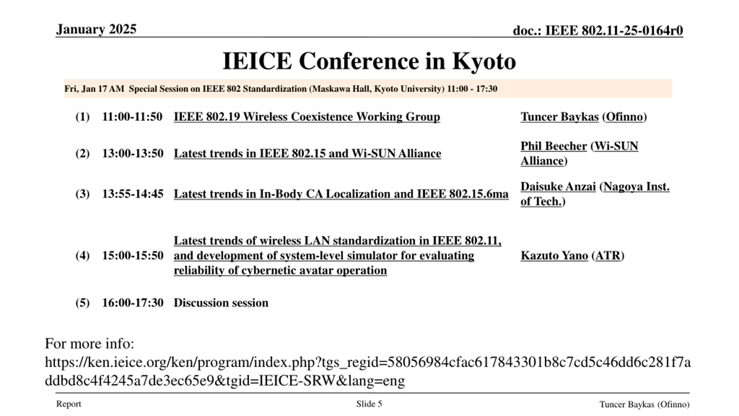 January 2025 doc.: IEEE 802.11-25-0164r0 IEICE Conference in Kyoto Fri, Jan 17 AM Special Session on IEEE 802 Standardization (Maskawa Hall, Kyoto University) 11:00 - 17:30 (1) 11:00-11:50 IEEE 802.19 Wireless Coexistence Working Group Tuncer Baykas (Ofinno) Phil Beecher (Wi-SUN Alliance) (2) 13:00-13:50 Latest trends in IEEE 802.15 and Wi-SUN Alliance Daisuke Anzai (Nagoya Inst. of Tech.) (3) 13:55-14:45 Latest trends in In-Body CA Localization and IEEE 802.15.6ma Latest trends of wireless LAN standardization in IEEE 802.11, and development of system-level simulator for evaluating reliability of cybernetic avatar operation (4) 15:00-15:50 Kazuto Yano (ATR) (5) 16:00-17:30 Discussion session For more info: https://ken.ieice.org/ken/program/index.php?tgs_regid=58056984cfac617843301b8c7cd5c46dd6c281f7a ddbd8c4f4245a7de3ec65e9&tgid=IEICE-SRW&lang=eng Report Slide 5 Tuncer Baykas (Ofinno)