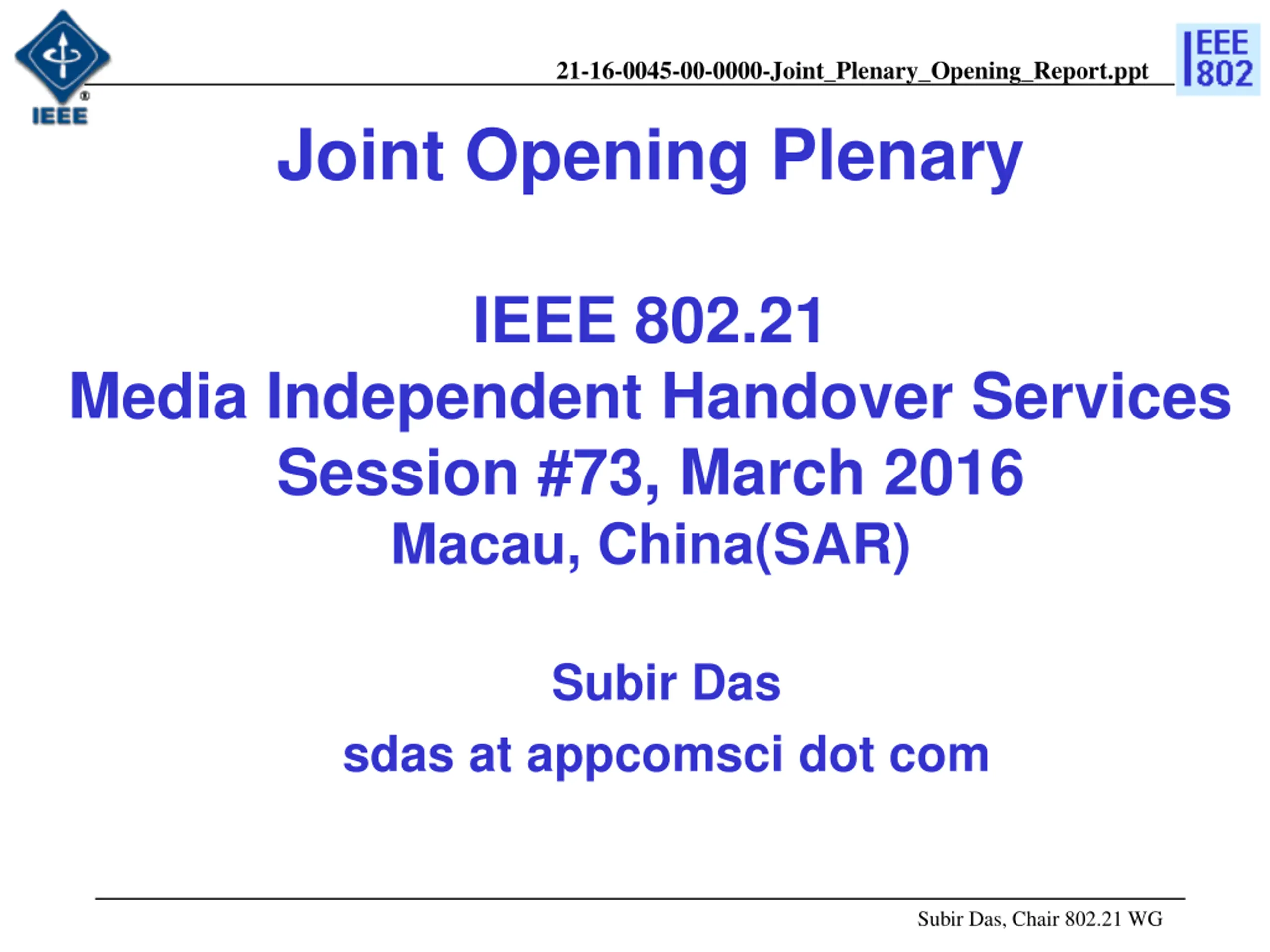 21-16-0045-00-0000-Joint_Plenary_Opening_Report.ppt Joint Opening Plenary IEEE 802.21 Media Independent Handover Services Session #73, March 2016 Macau, China(SAR) Subir Das sdas at appcomsci dot com Subir Das, Chair 802.21 WG