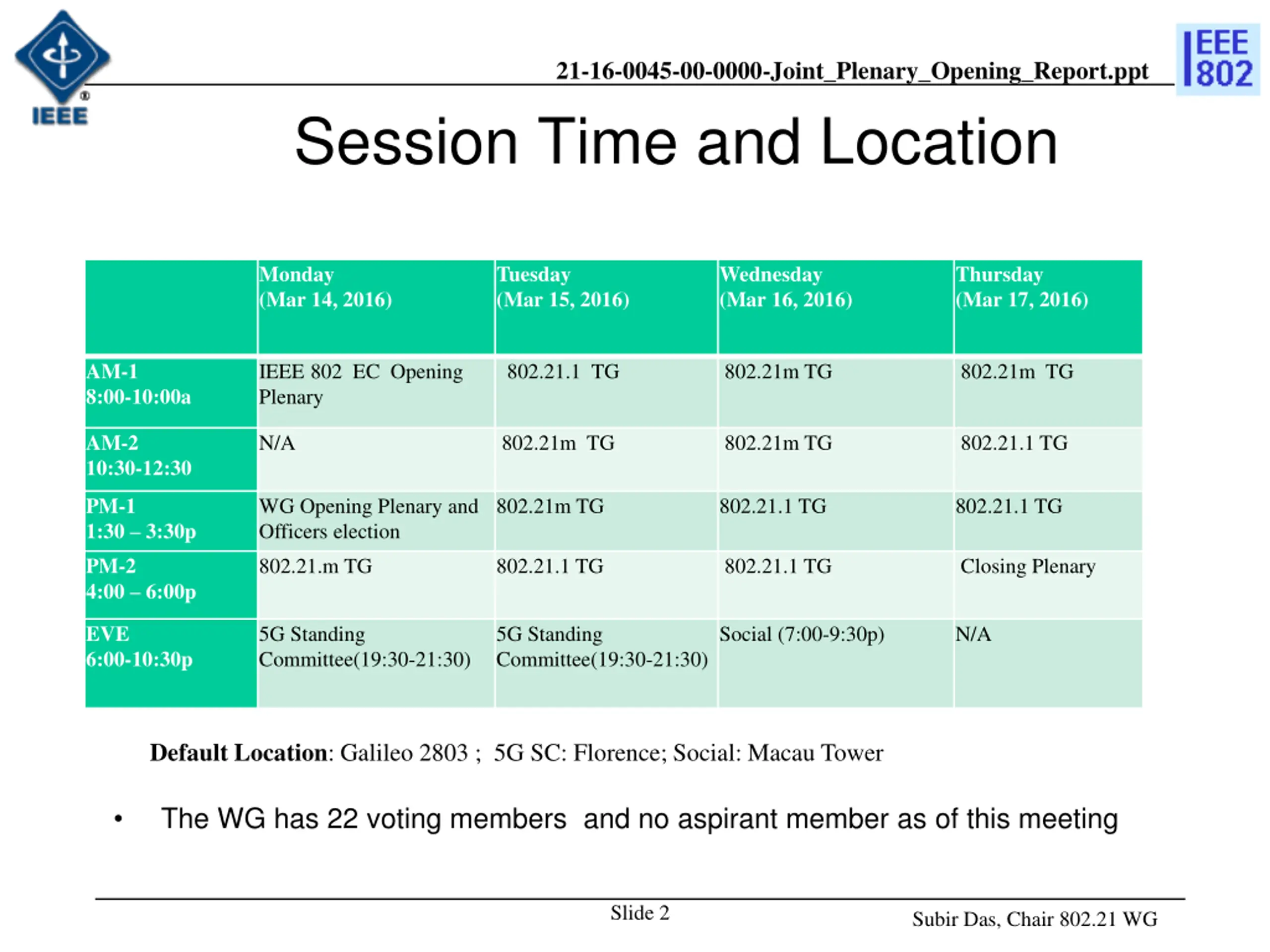 21-16-0045-00-0000-Joint_Plenary_Opening_Report.ppt Session Time and Location Monday (Mar 14, 2016) Tuesday (Mar 15, 2016) Wednesday (Mar 16, 2016) Thursday (Mar 17, 2016) AM-1 8:00-10:00a IEEE 802 EC Opening Plenary 802.21.1 TG 802.21m TG 802.21m TG AM-2 10:30-12:30 N/A 802.21m TG 802.21m TG 802.21.1 TG PM-1 1:30 3:30p PM-2 4:00 6:00p WG Opening Plenary and Officers election 802.21m TG 802.21.1 TG 802.21.1 TG 802.21.m TG 802.21.1 TG 802.21.1 TG Closing Plenary EVE 6:00-10:30p 5G Standing Committee(19:30-21:30) 5G Standing Committee(19:30-21:30) Social (7:00-9:30p) N/A Default Location: Galileo 2803 ; 5G SC: Florence; Social: Macau Tower The WG has 22 voting members and no aspirant member as of this meeting Slide 2 Subir Das, Chair 802.21 WG