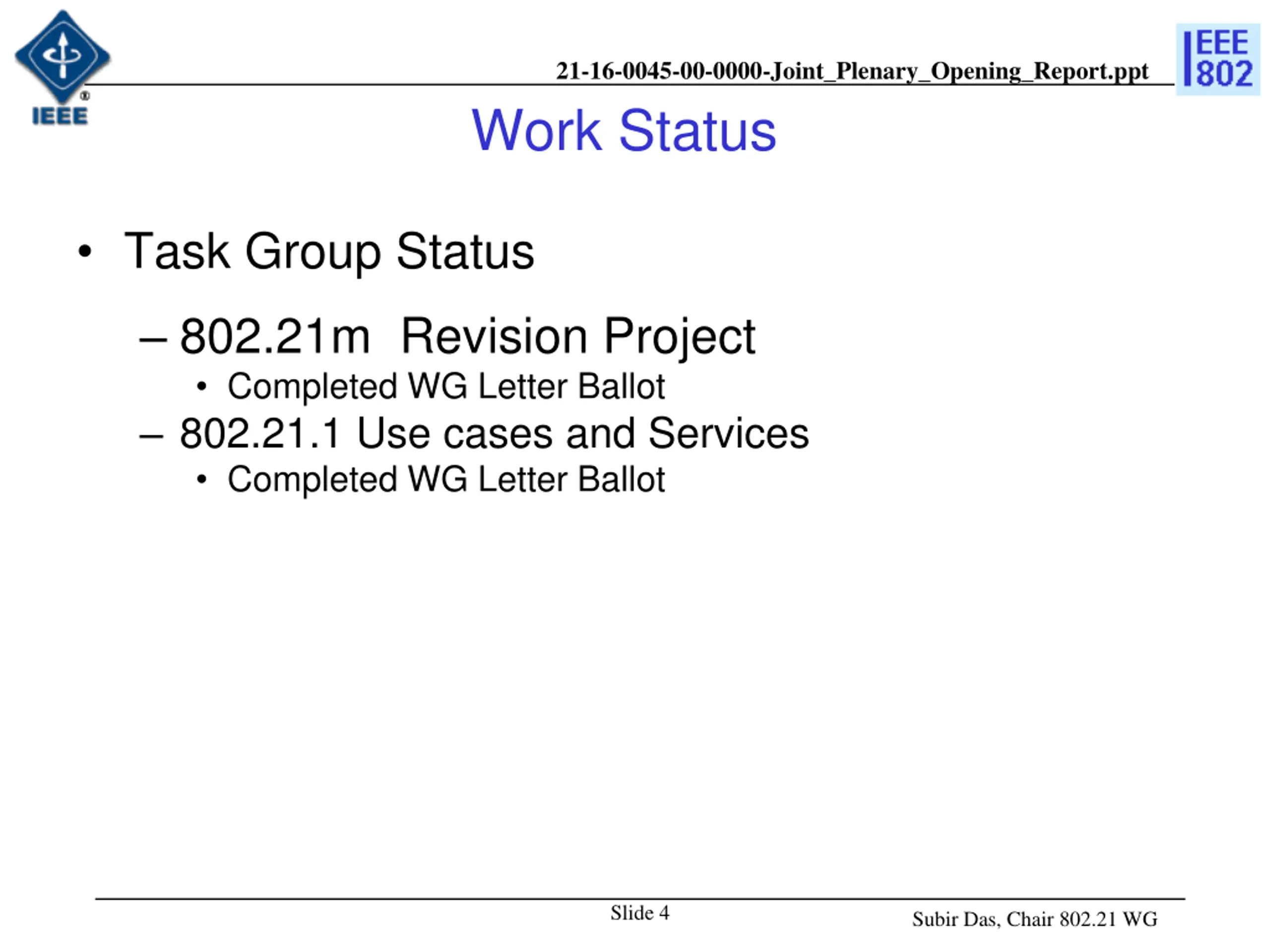 21-16-0045-00-0000-Joint_Plenary_Opening_Report.ppt Work Status Task Group Status 802.21m Revision Project Completed WG Letter Ballot 802.21.1 Use cases and Services Completed WG Letter Ballot Slide 4 Subir Das, Chair 802.21 WG