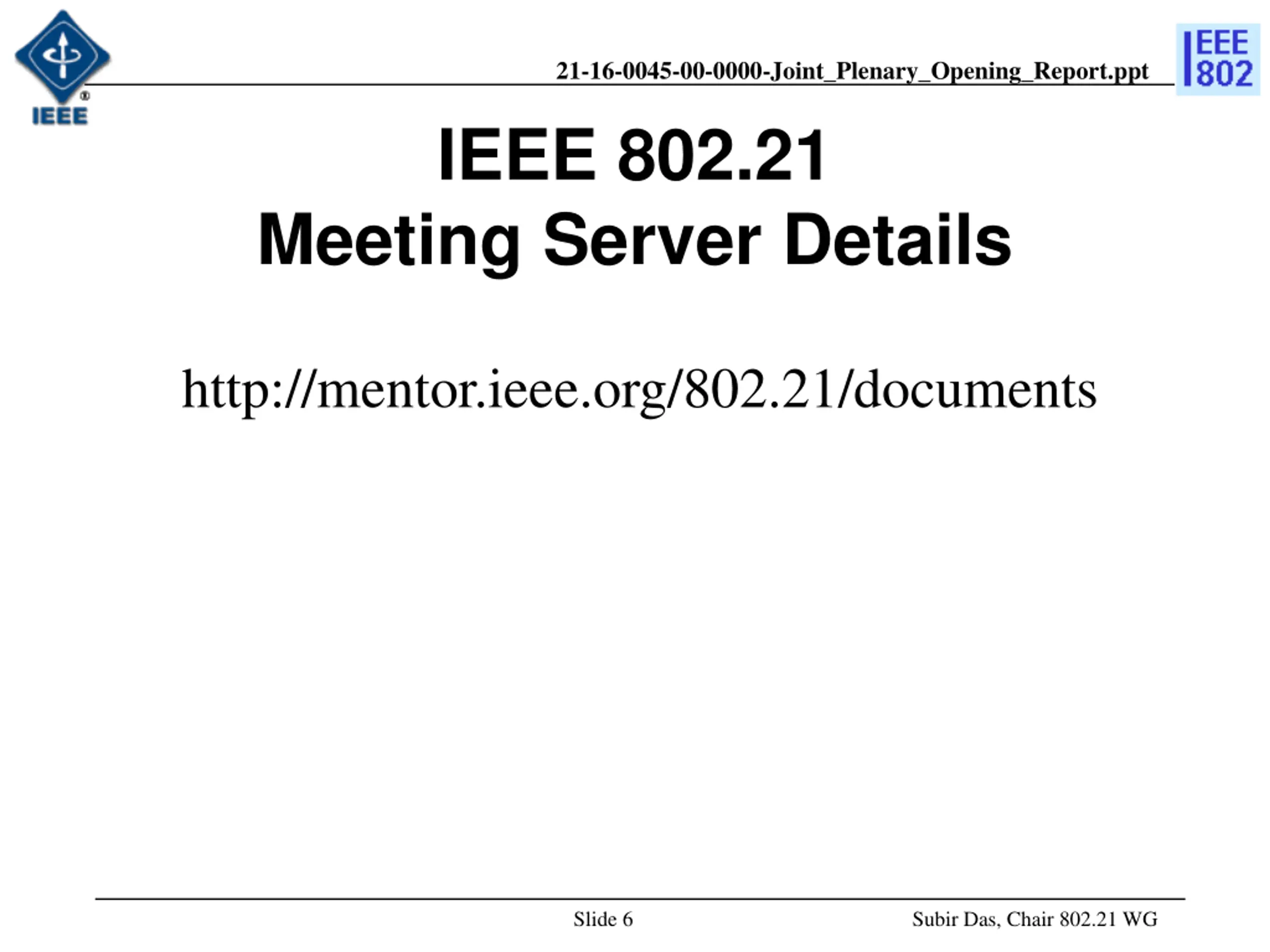 21-16-0045-00-0000-Joint_Plenary_Opening_Report.ppt IEEE 802.21 Meeting Server Details http://mentor.ieee.org/802.21/documents Slide 6 Subir Das, Chair 802.21 WG