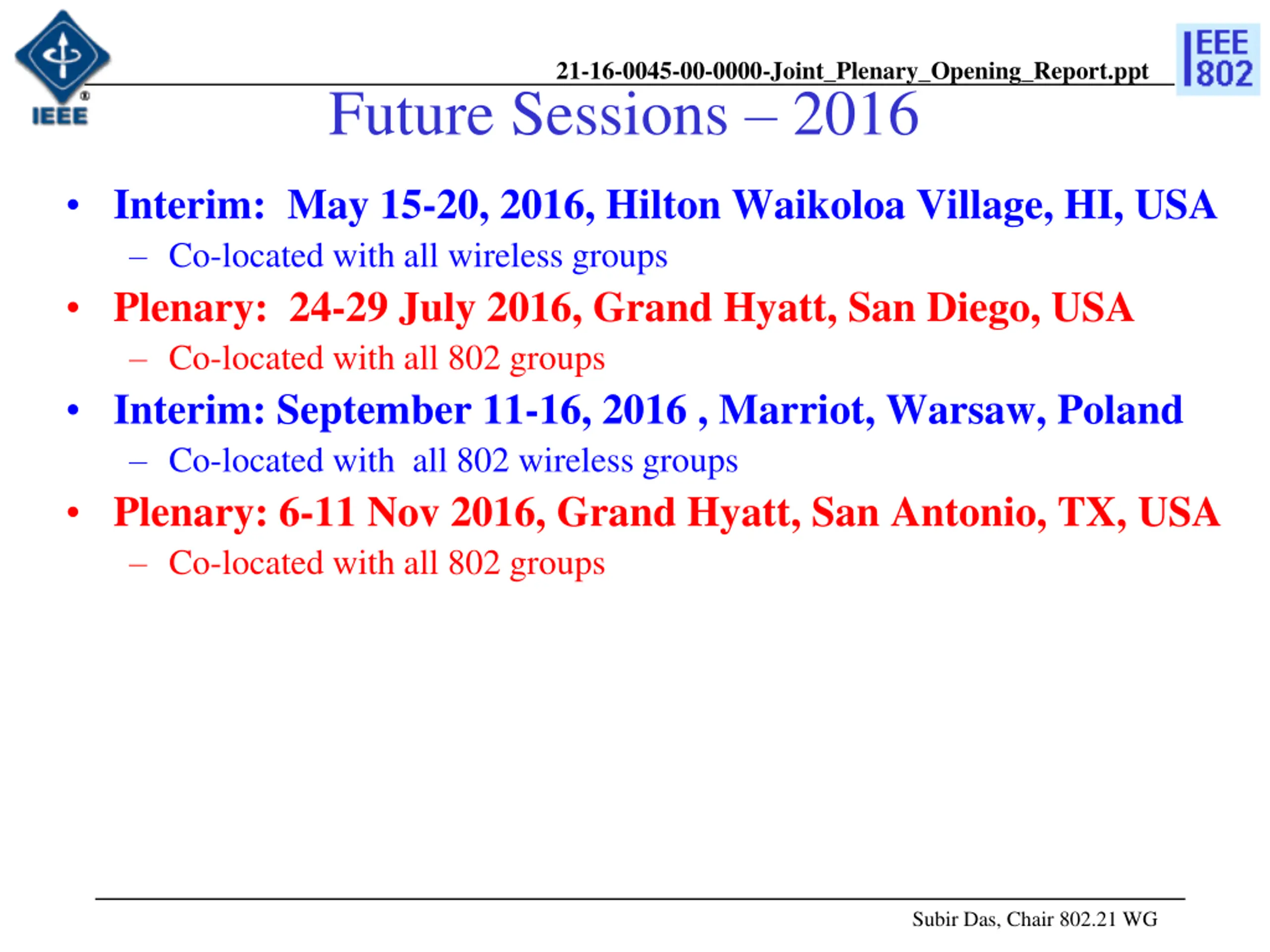 21-16-0045-00-0000-Joint_Plenary_Opening_Report.ppt Future Sessions 2016 Interim: May 15-20, 2016, Hilton Waikoloa Village, HI, USA Co-located with all wireless groups Plenary: 24-29 July 2016, Grand Hyatt, San Diego, USA Co-located with all 802 groups Interim: September 11-16, 2016 , Marriot, Warsaw, Poland Co-located with all 802 wireless groups Plenary: 6-11 Nov 2016, Grand Hyatt, San Antonio, TX, USA Co-located with all 802 groups Subir Das, Chair 802.21 WG