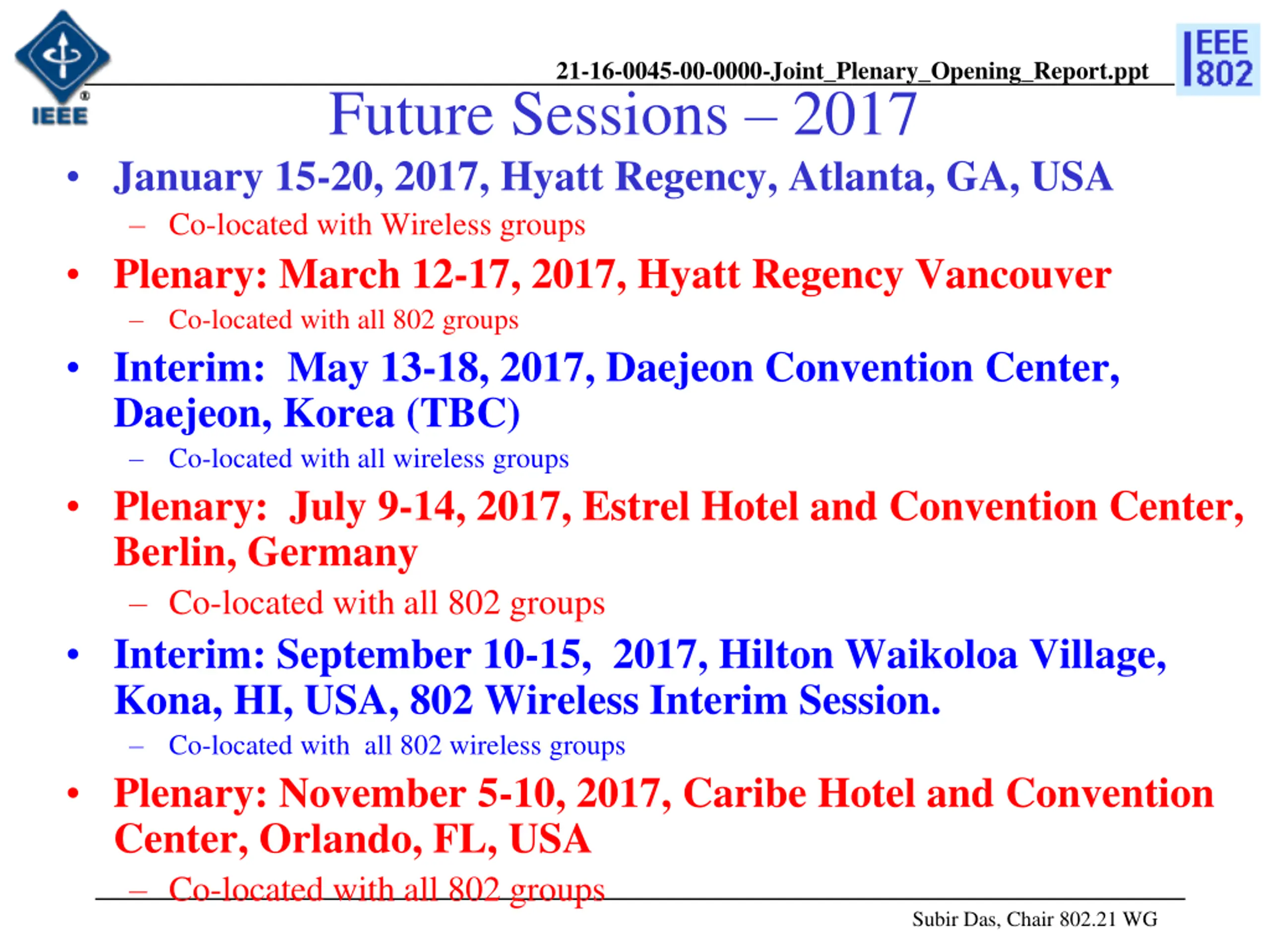 21-16-0045-00-0000-Joint_Plenary_Opening_Report.ppt Future Sessions 2017 January 15-20, 2017, Hyatt Regency, Atlanta, GA, USA Co-located with Wireless groups Plenary: March 12-17, 2017, Hyatt Regency Vancouver Co-located with all 802 groups Interim: May 13-18, 2017, Daejeon Convention Center, Daejeon, Korea (TBC) Co-located with all wireless groups Plenary: July 9-14, 2017, Estrel Hotel and Convention Center, Berlin, Germany Co-located with all 802 groups Interim: September 10-15, 2017, Hilton Waikoloa Village, Kona, HI, USA, 802 Wireless Interim Session. Co-located with all 802 wireless groups Plenary: November 5-10, 2017, Caribe Hotel and Convention Center, Orlando, FL, USA Co-located with all 802 groups Subir Das, Chair 802.21 WG