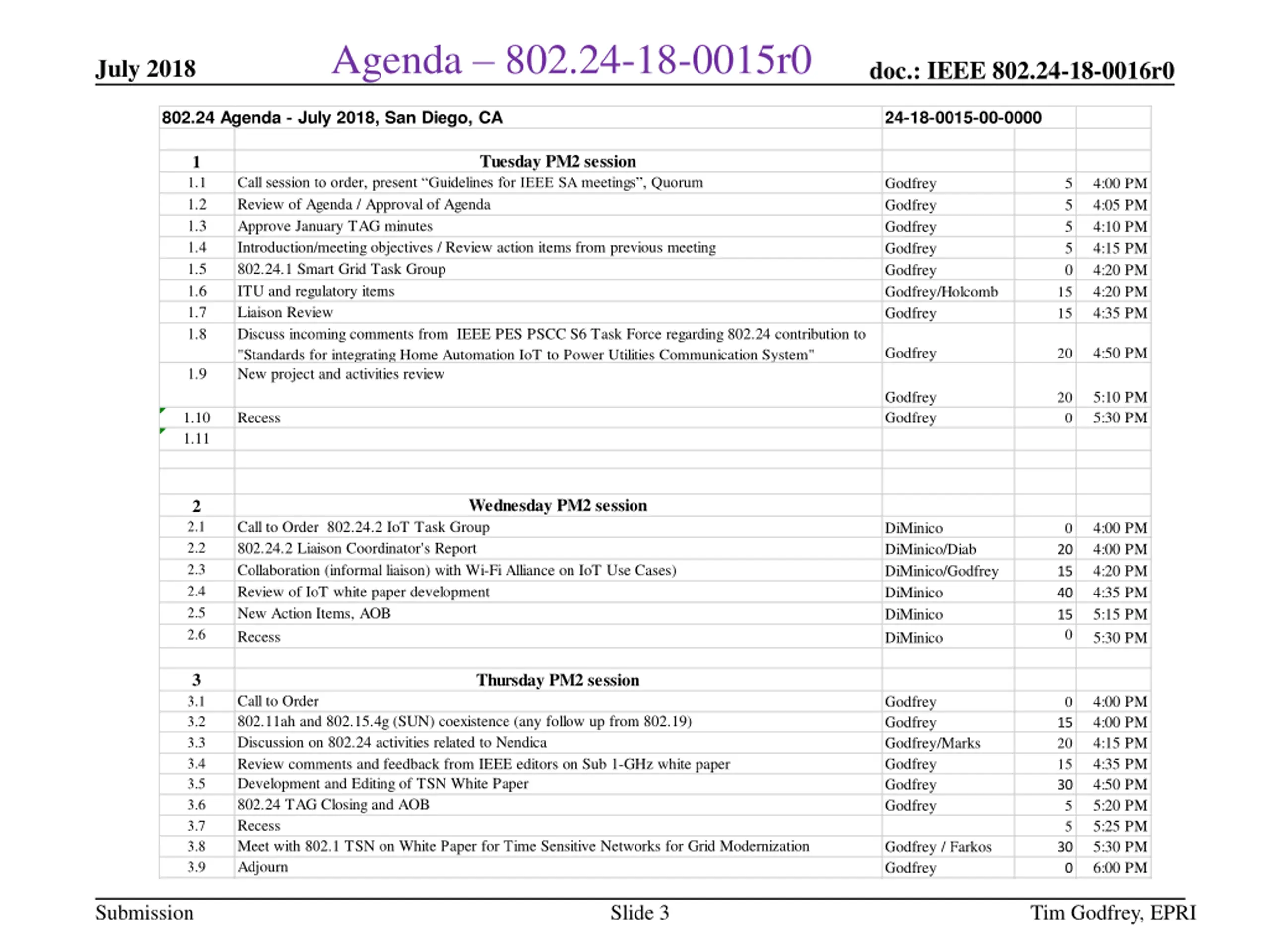 Agenda 802.24-18-0015r0 July 2018 doc.: IEEE 802.24-18-0016r0 802.24 Agenda - July 2018, San Diego, CA 24-18-0015-00-0000 Tuesday PM2 session 1 1.1 1.2 1.3 1.4 1.5 1.6 1.7 1.8 Call session to order, present Guidelines for IEEE SA meetings , Quorum Review of Agenda / Approval of Agenda Approve January TAG minutes Introduction/meeting objectives / Review action items from previous meeting 802.24.1 Smart Grid Task Group ITU and regulatory items Liaison Review Discuss incoming comments from IEEE PES PSCC S6 Task Force regarding 802.24 contribution to "Standards for integrating Home Automation IoT to Power Utilities Communication System" New project and activities review Godfrey Godfrey Godfrey Godfrey Godfrey Godfrey/Holcomb Godfrey 5 5 5 5 0 4:00 PM 4:05 PM 4:10 PM 4:15 PM 4:20 PM 4:20 PM 4:35 PM 15 15 Godfrey 4:50 PM 20 1.9 Godfrey Godfrey 5:10 PM 5:30 PM 20 1.10 1.11 Recess 0 Wednesday PM2 session 2 2.1 2.2 2.3 2.4 2.5 2.6 Call to Order 802.24.2 IoT Task Group 802.24.2 Liaison Coordinator's Report Collaboration (informal liaison) with Wi-Fi Alliance on IoT Use Cases) Review of IoT white paper development New Action Items, AOB Recess DiMinico DiMinico/Diab DiMinico/Godfrey DiMinico DiMinico DiMinico 4:00 PM 4:00 PM 4:20 PM 4:35 PM 5:15 PM 5:30 PM 0 20 15 40 15 0 3 Thursday PM2 session Call to Order 802.11ah and 802.15.4g (SUN) coexistence (any follow up from 802.19) Discussion on 802.24 activities related to Nendica Review comments and feedback from IEEE editors on Sub 1-GHz white paper Development and Editing of TSN White Paper 802.24 TAG Closing and AOB Recess Meet with 802.1 TSN on White Paper for Time Sensitive Networks for Grid Modernization Adjourn 3.1 3.2 3.3 3.4 3.5 3.6 3.7 3.8 3.9 Godfrey Godfrey Godfrey/Marks Godfrey Godfrey Godfrey 4:00 PM 4:00 PM 4:15 PM 4:35 PM 4:50 PM 5:20 PM 5:25 PM 5:30 PM 6:00 PM 0 15 20 15 30 5 5 30 0 Godfrey / Farkos Godfrey Submission Slide 3 Tim Godfrey, EPRI