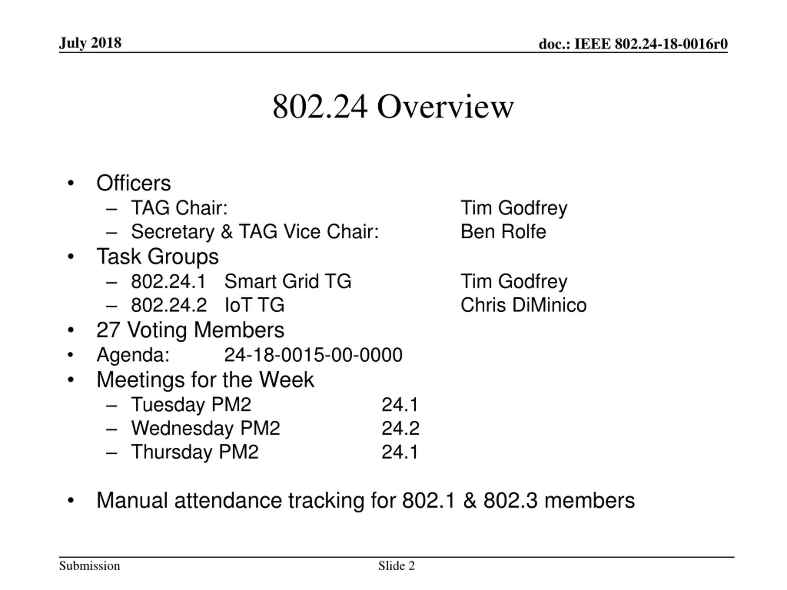 July 2018 doc.: IEEE 802.24-18-0016r0 802.24 Overview Officers TAG Chair: Secretary & TAG Vice Chair: Task Groups 802.24.1 Smart Grid TG 802.24.2 IoT TG 27 Voting Members Agenda: 24-18-0015-00-0000 Meetings for the Week Tuesday PM2 Wednesday PM2 Thursday PM2 Tim Godfrey Ben Rolfe Tim Godfrey Chris DiMinico 24.1 24.2 24.1 Manual attendance tracking for 802.1 & 802.3 members Submission Slide 2