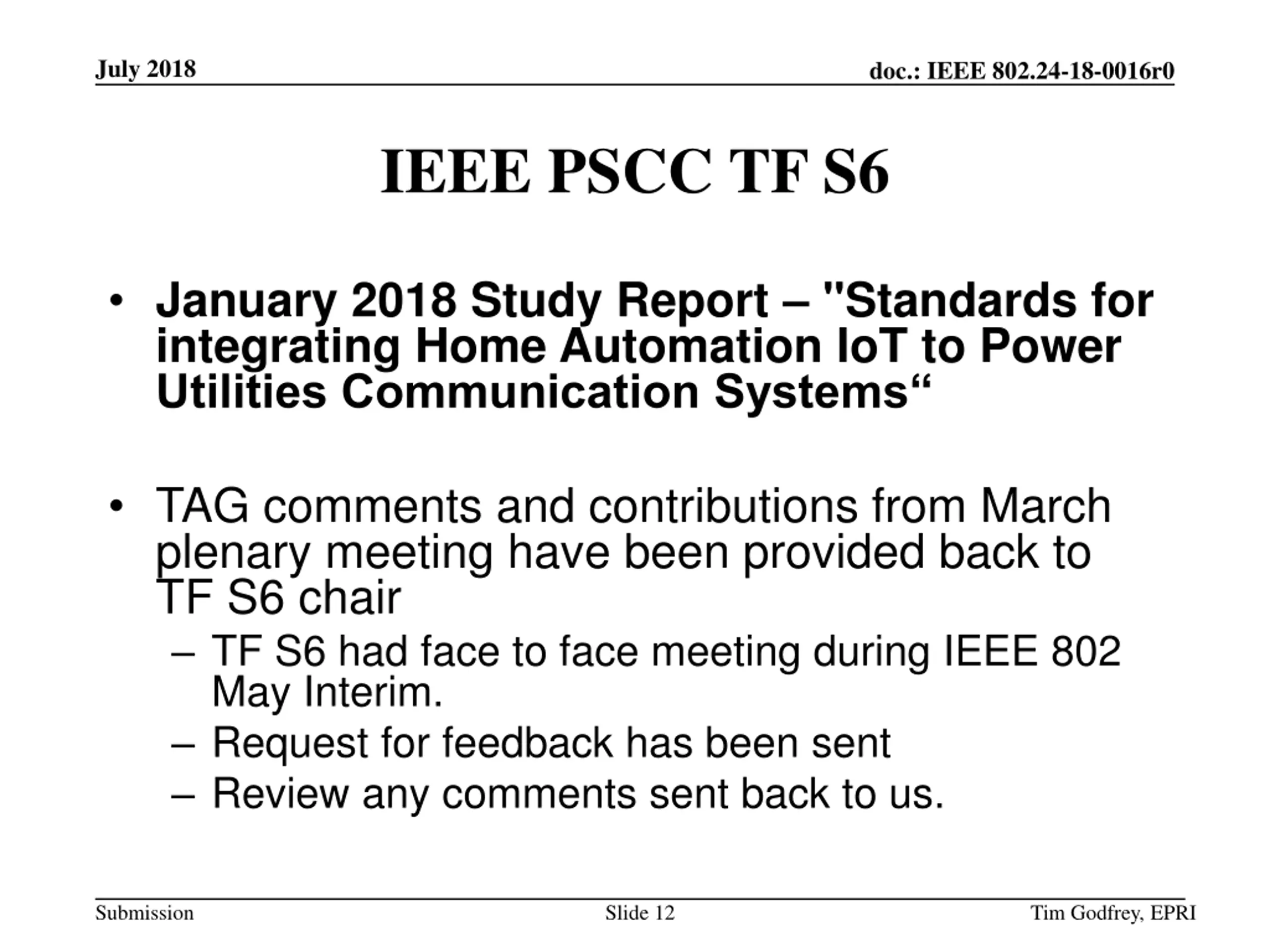 July 2018 doc.: IEEE 802.24-18-0016r0 IEEE PSCC TF S6 January 2018 Study Report "Standards for integrating Home Automation IoT to Power Utilities Communication Systems TAG comments and contributions from March plenary meeting have been provided back to TF S6 chair TF S6 had face to face meeting during IEEE 802 May Interim. Request for feedback has been sent Review any comments sent back to us. Submission Slide 12 Tim Godfrey, EPRI