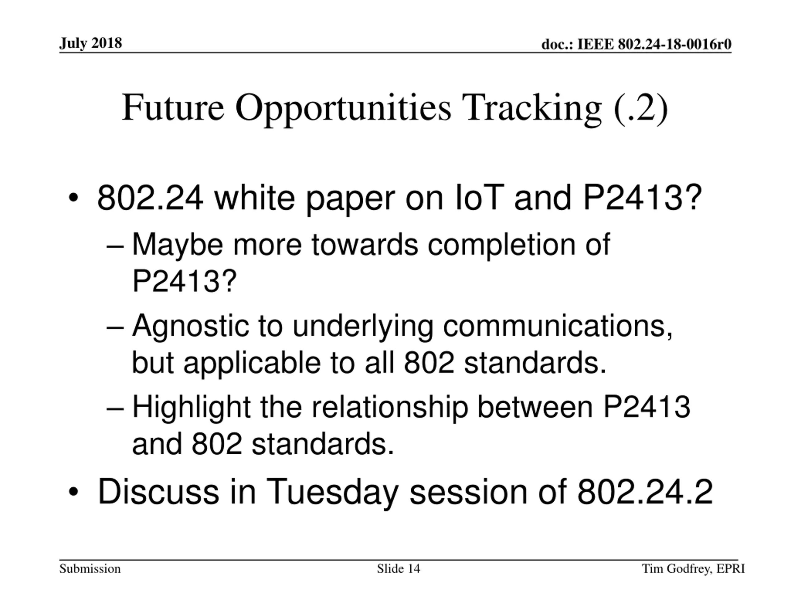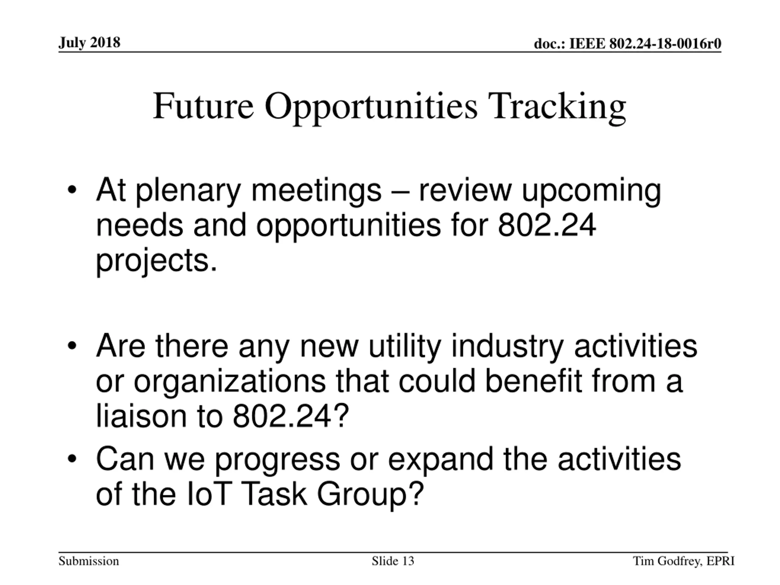 July 2018 doc.: IEEE 802.24-18-0016r0 Future Opportunities Tracking At plenary meetings review upcoming needs and opportunities for 802.24 projects. Are there any new utility industry activities or organizations that could benefit from a liaison to 802.24? Can we progress or expand the activities of the IoT Task Group? Submission Slide 13 Tim Godfrey, EPRI