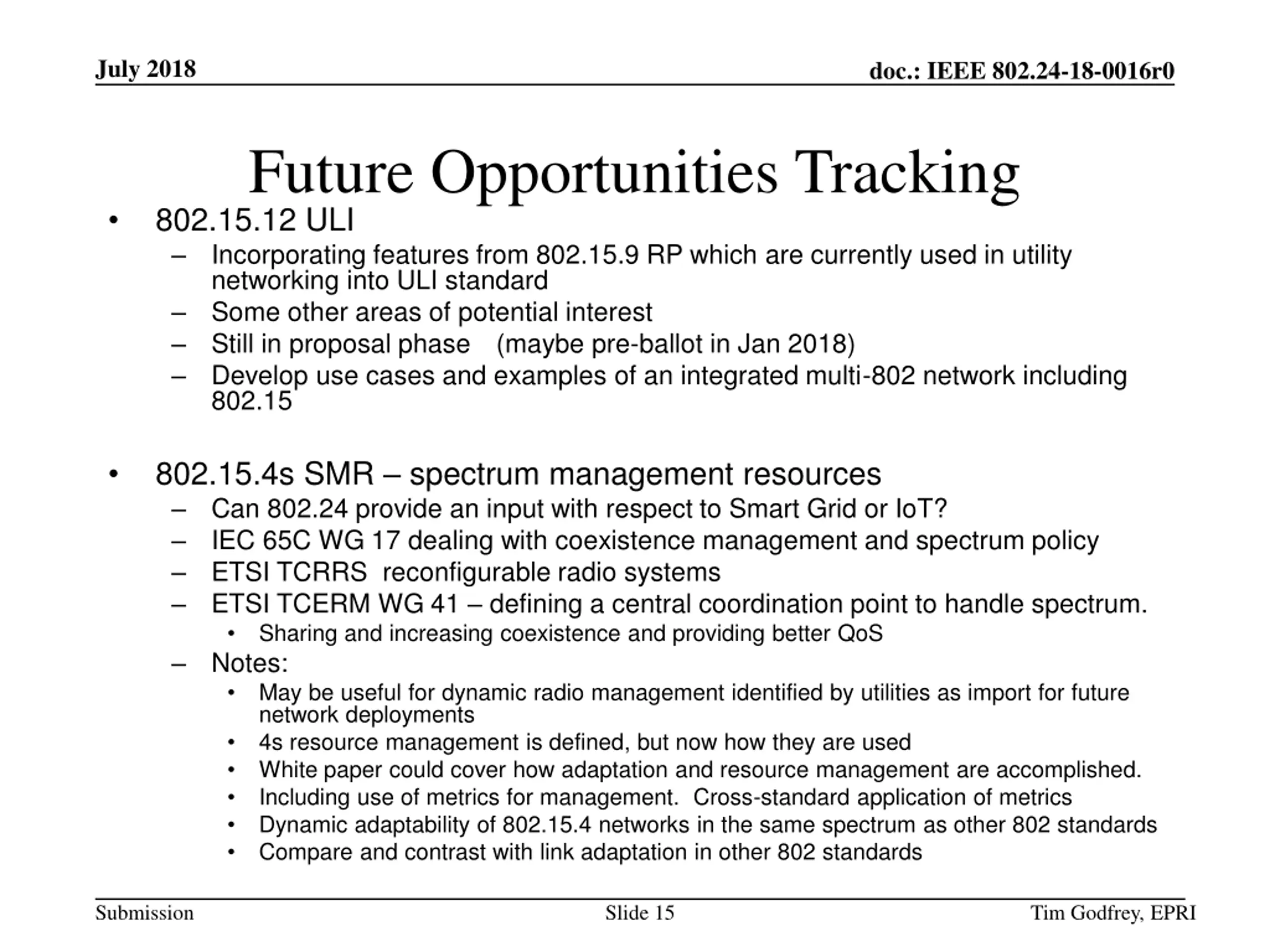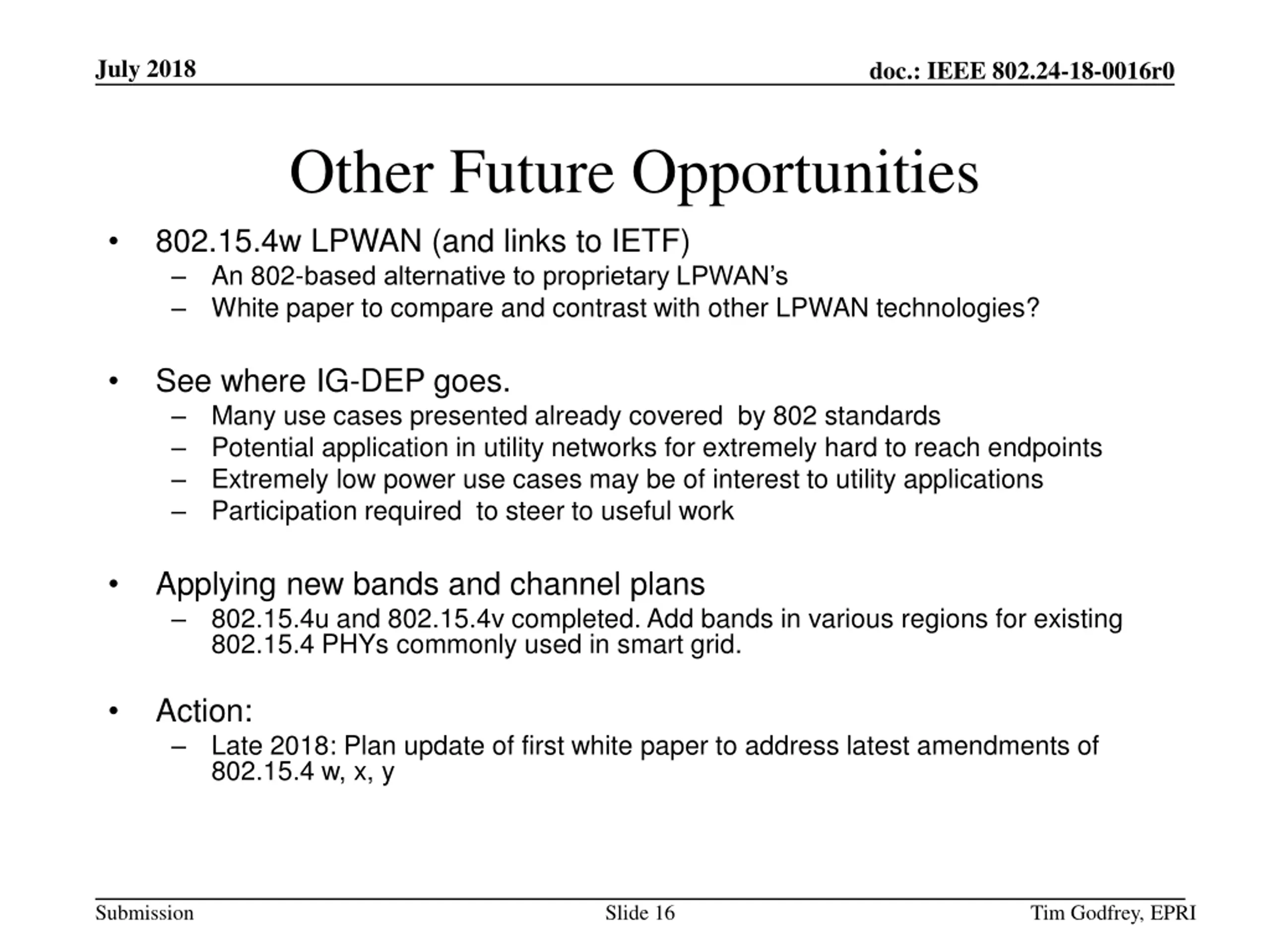 July 2018 doc.: IEEE 802.24-18-0016r0 Future Opportunities Tracking 802.15.12 ULI Incorporating features from 802.15.9 RP which are currently used in utility networking into ULI standard Some other areas of potential interest Still in proposal phase (maybe pre-ballot in Jan 2018) Develop use cases and examples of an integrated multi-802 network including 802.15 802.15.4s SMR spectrum management resources Can 802.24 provide an input with respect to Smart Grid or IoT? IEC 65C WG 17 dealing with coexistence management and spectrum policy ETSI TCRRS reconfigurable radio systems ETSI TCERM WG 41 defining a central coordination point to handle spectrum. Sharing and increasing coexistence and providing better QoS Notes: May be useful for dynamic radio management identified by utilities as import for future network deployments 4s resource management is defined, but now how they are used White paper could cover how adaptation and resource management are accomplished. Including use of metrics for management. Cross-standard application of metrics Dynamic adaptability of 802.15.4 networks in the same spectrum as other 802 standards Compare and contrast with link adaptation in other 802 standards Submission Slide 15 Tim Godfrey, EPRI