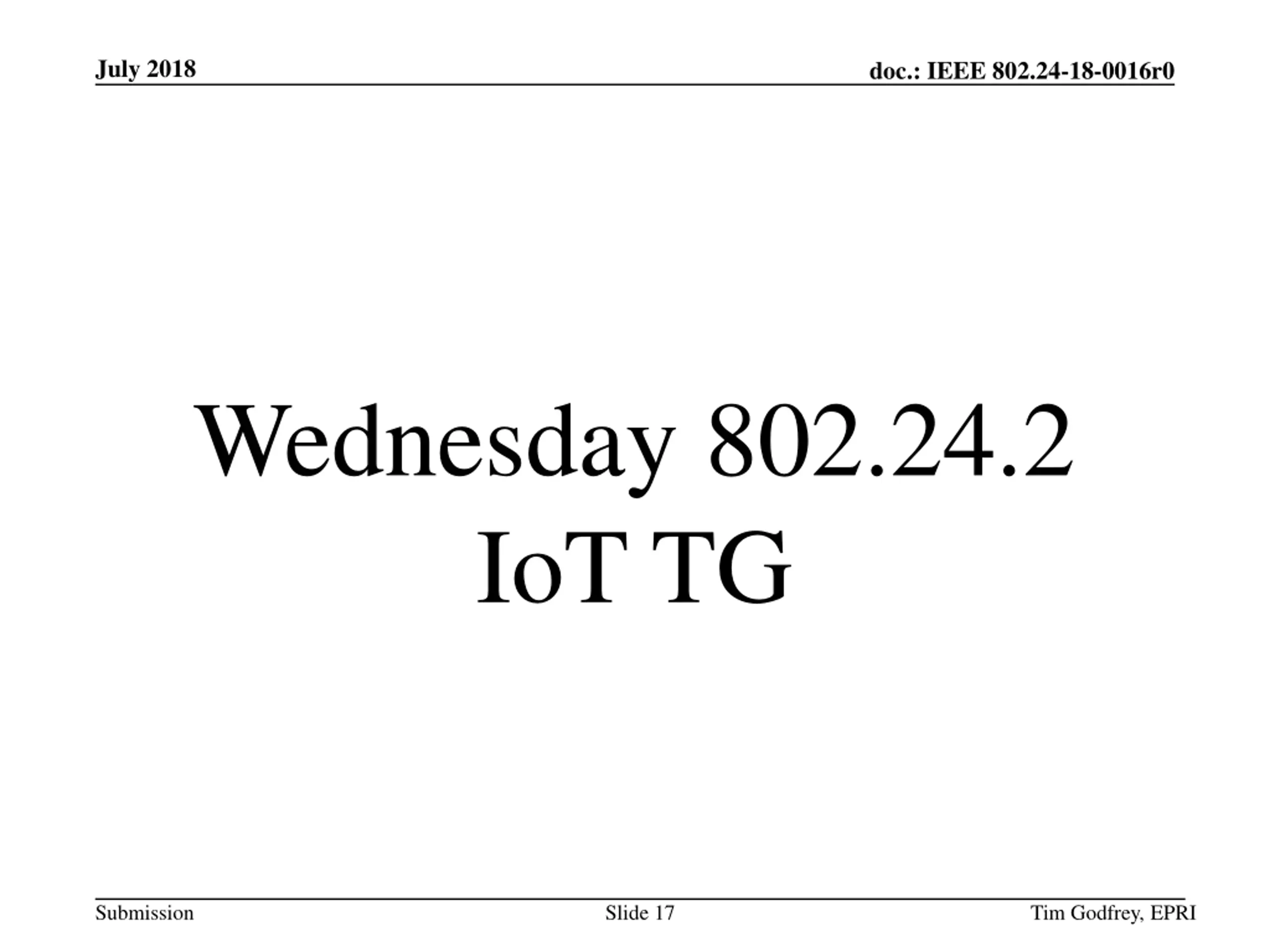 July 2018 doc.: IEEE 802.24-18-0016r0 Wednesday 802.24.2 IoT TG Submission Slide 17 Tim Godfrey, EPRI