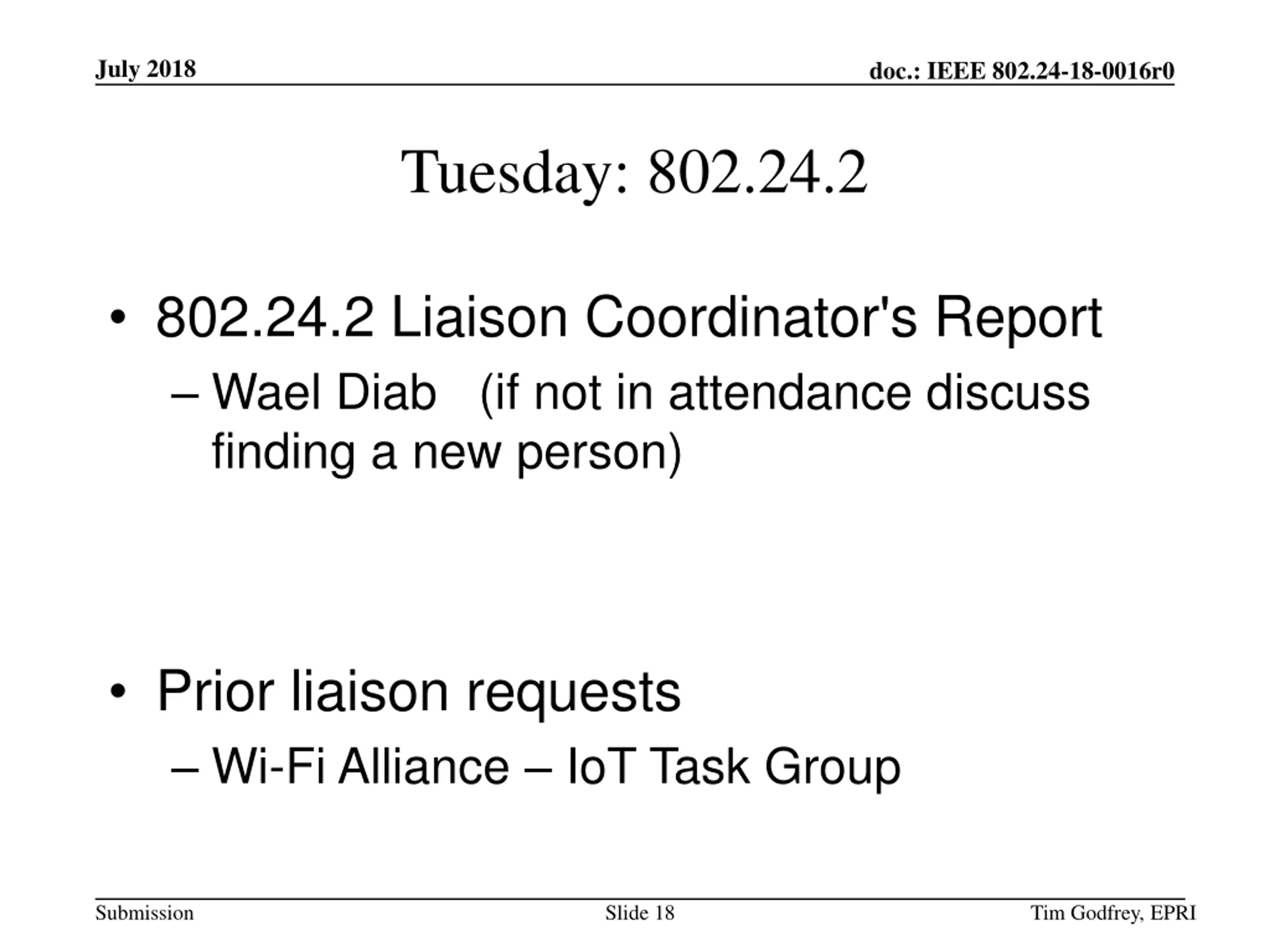 July 2018 doc.: IEEE 802.24-18-0016r0 Tuesday: 802.24.2 802.24.2 Liaison Coordinator's Report Wael Diab (if not in attendance discuss finding a new person) Prior liaison requests Wi-Fi Alliance IoT Task Group Submission Slide 18 Tim Godfrey, EPRI