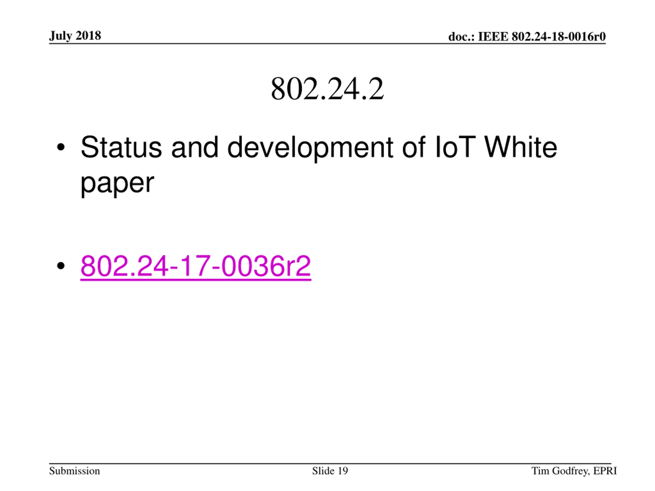 July 2018 doc.: IEEE 802.24-18-0016r0 802.24.2 Status and development of IoT White paper 802.24-17-0036r2 Submission Slide 19 Tim Godfrey, EPRI