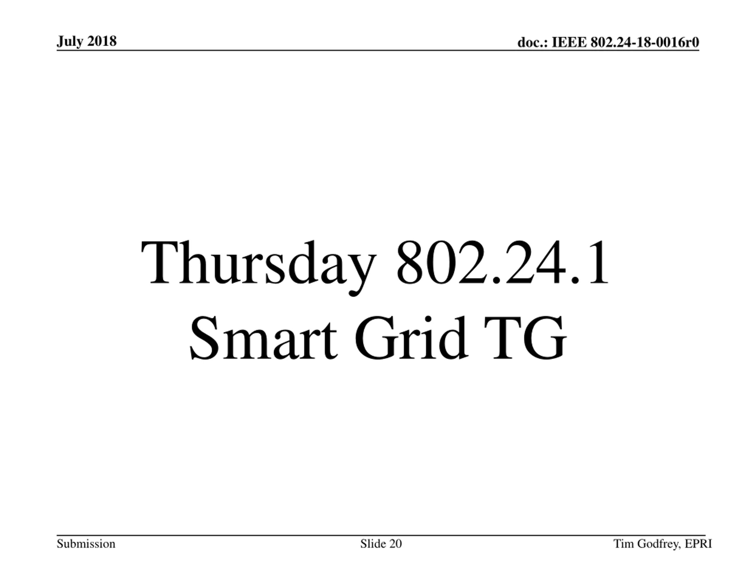 July 2018 doc.: IEEE 802.24-18-0016r0 Thursday 802.24.1 Smart Grid TG Submission Slide 20 Tim Godfrey, EPRI