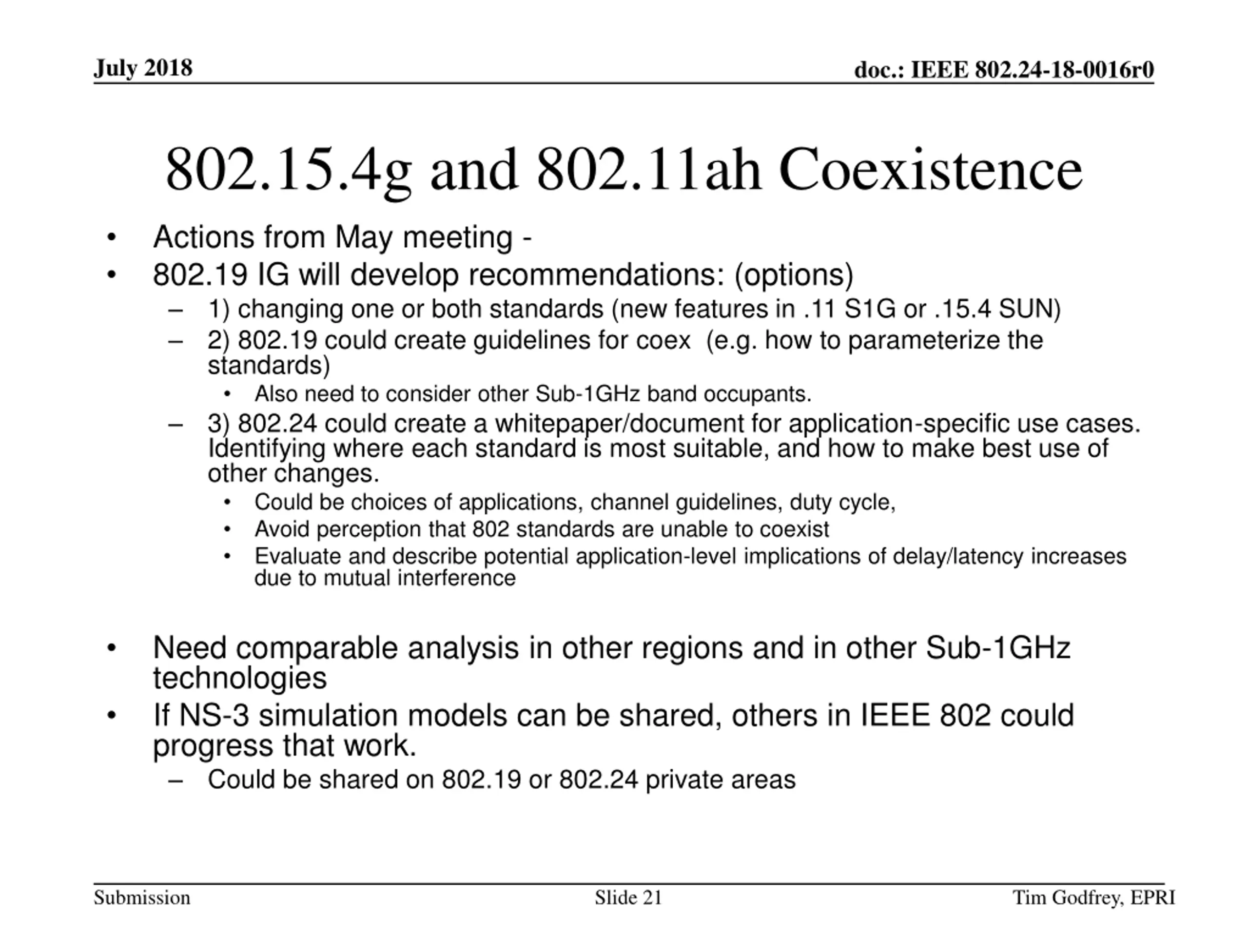 July 2018 doc.: IEEE 802.24-18-0016r0 802.15.4g and 802.11ah Coexistence Actions from May meeting - 802.19 IG will develop recommendations: (options) 1) changing one or both standards (new features in .11 S1G or .15.4 SUN) 2) 802.19 could create guidelines for coex (e.g. how to parameterize the standards) Also need to consider other Sub-1GHz band occupants. 3) 802.24 could create a whitepaper/document for application-specific use cases. Identifying where each standard is most suitable, and how to make best use of other changes. Could be choices of applications, channel guidelines, duty cycle, Avoid perception that 802 standards are unable to coexist Evaluate and describe potential application-level implications of delay/latency increases due to mutual interference Need comparable analysis in other regions and in other Sub-1GHz technologies If NS-3 simulation models can be shared, others in IEEE 802 could progress that work. Could be shared on 802.19 or 802.24 private areas Submission Slide 21 Tim Godfrey, EPRI