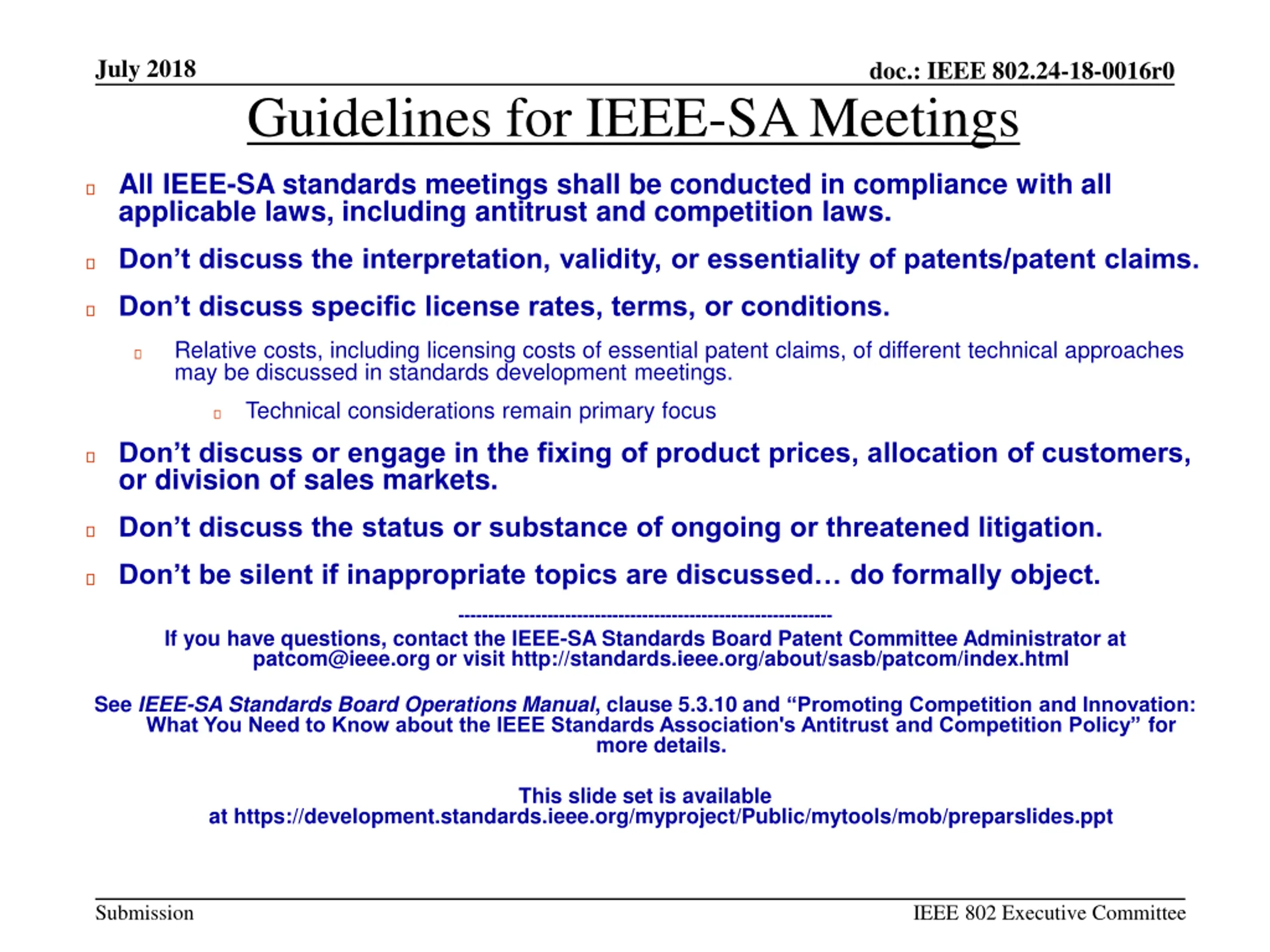 July 2018 doc.: IEEE 802.24-18-0016r0 Guidelines for IEEE-SA Meetings All IEEE-SA standards meetings shall be conducted in compliance with all applicable laws, including antitrust and competition laws. Don t discuss the interpretation, validity, or essentiality of patents/patent claims. Don t discuss specific license rates, terms, or conditions. Relative costs, including licensing costs of essential patent claims, of different technical approaches may be discussed in standards development meetings. Technical considerations remain primary focus Don t discuss or engage in the fixing of product prices, allocation of customers, or division of sales markets. Don t discuss the status or substance of ongoing or threatened litigation. Don t be silent if inappropriate topics are discussed do formally object. --------------------------------------------------------------- If you have questions, contact the IEEE-SA Standards Board Patent Committee Administrator at patcom@ieee.org or visit http://standards.ieee.org/about/sasb/patcom/index.html See IEEE-SA Standards Board Operations Manual, clause 5.3.10 and Promoting Competition and Innovation: What You Need to Know about the IEEE Standards Association's Antitrust and Competition Policy for more details. This slide set is available at https://development.standards.ieee.org/myproject/Public/mytools/mob/preparslides.ppt Submission IEEE 802 Executive Committee