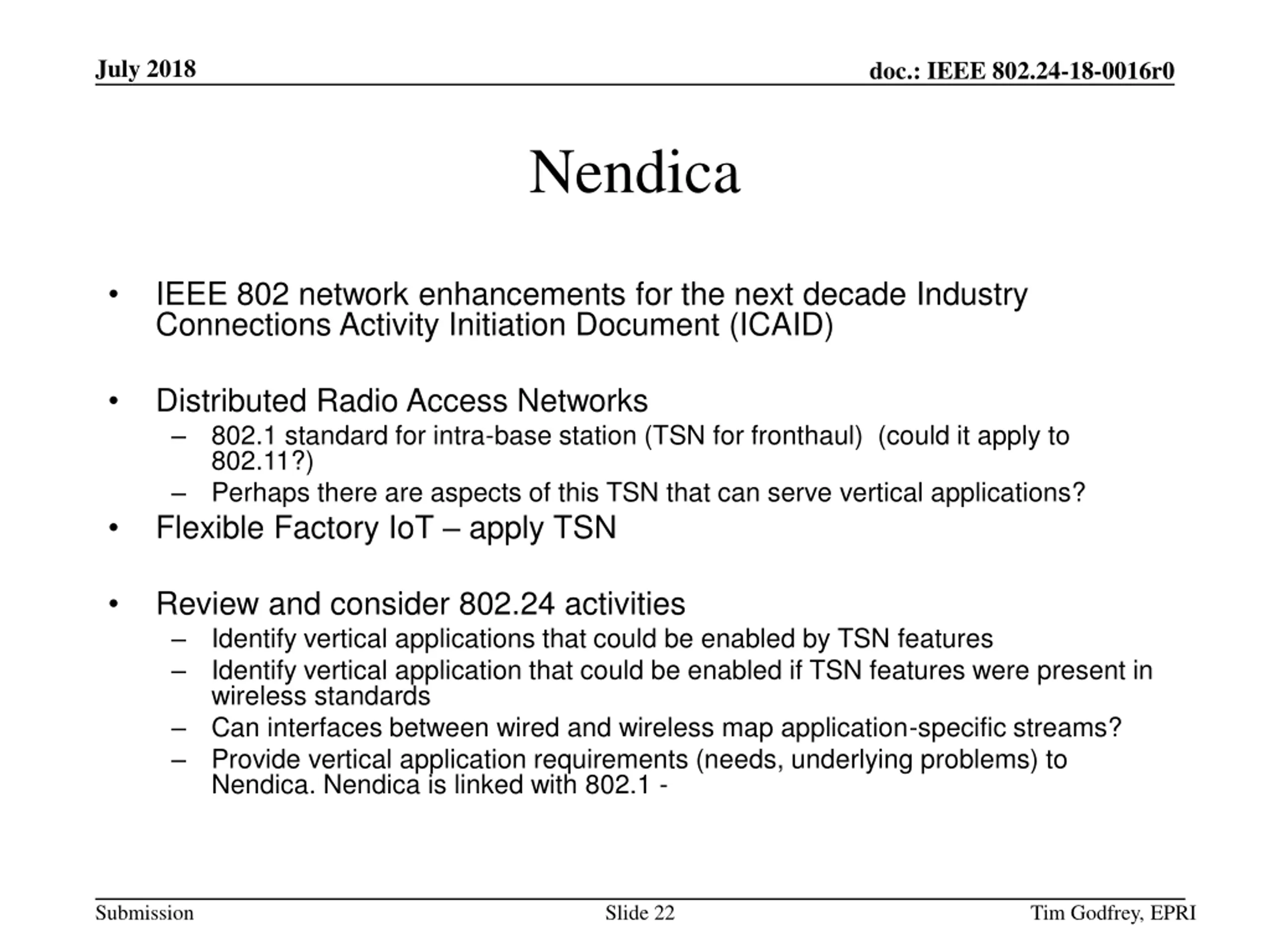 July 2018 doc.: IEEE 802.24-18-0016r0 Nendica IEEE 802 network enhancements for the next decade Industry Connections Activity Initiation Document (ICAID) Distributed Radio Access Networks 802.1 standard for intra-base station (TSN for fronthaul) (could it apply to 802.11?) Perhaps there are aspects of this TSN that can serve vertical applications? Flexible Factory IoT apply TSN Review and consider 802.24 activities Identify vertical applications that could be enabled by TSN features Identify vertical application that could be enabled if TSN features were present in wireless standards Can interfaces between wired and wireless map application-specific streams? Provide vertical application requirements (needs, underlying problems) to Nendica. Nendica is linked with 802.1 - Submission Slide 22 Tim Godfrey, EPRI