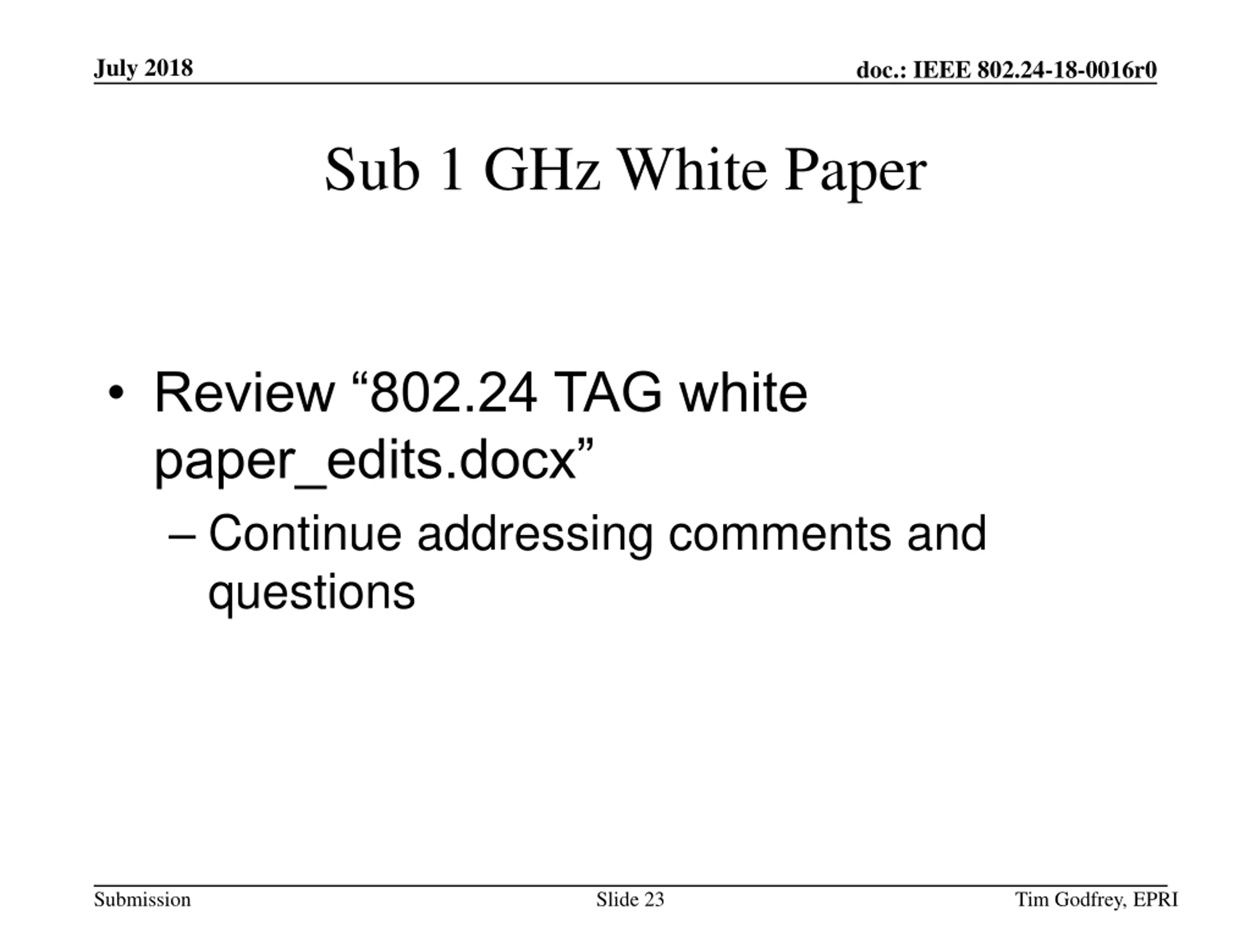 July 2018 doc.: IEEE 802.24-18-0016r0 Sub 1 GHz White Paper Review 802.24 TAG white paper_edits.docx Continue addressing comments and questions Submission Slide 23 Tim Godfrey, EPRI