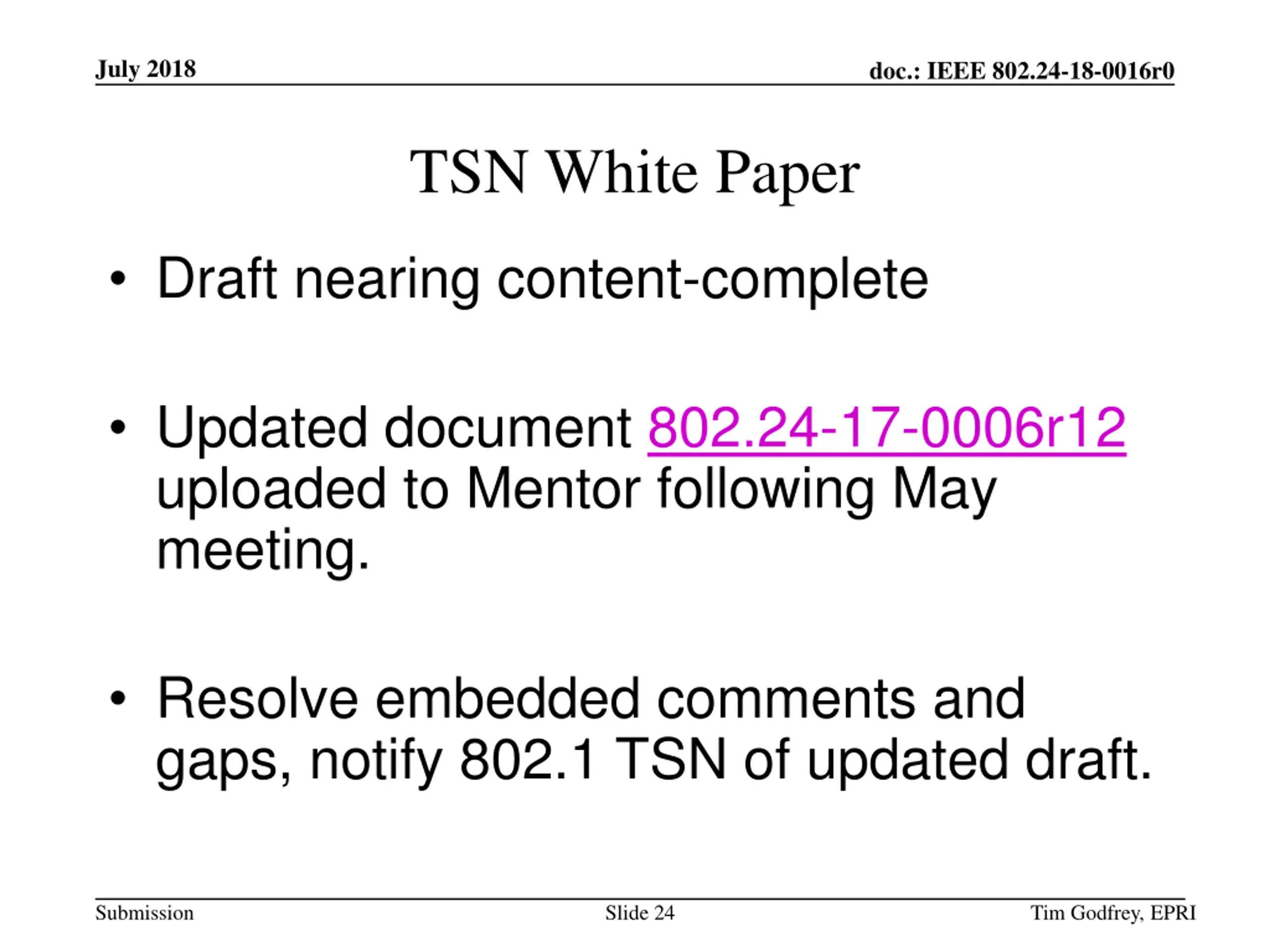 July 2018 doc.: IEEE 802.24-18-0016r0 TSN White Paper Draft nearing content-complete Updated document 802.24-17-0006r12 uploaded to Mentor following May meeting. Resolve embedded comments and gaps, notify 802.1 TSN of updated draft. Submission Slide 24 Tim Godfrey, EPRI